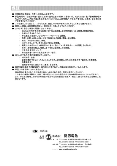 ●●●●●・・・・・・・・・・●・・・●●TEL(06)6785-6001㈹FAX(06)6785-6002東京支社〒144-0035東京都大田区南蒲田2丁目4番4号TEL(03)5710-2001㈹FAX(03)5710-2005ホームページwww.kansaidennetsu.co.jp修理困難な場所や危険な場所、高所等に設置されている場合は出張修理いたしかねます。保証は日本国内において有効です。日本国内で購入された当社製品を海外へ輸出された場合、保証は適用外となります。この場合の保証の適用は、当社工場へ返送いただいた製品の持ち込み修理のみとさせていただきます。また、持ち込み修理、及びその修理後の返却のための必要な輸出入、輸送にともなう費用はお客様のご負担となります。熱風発生機製造販売元株式会社関西電熱本社〒577-8566東大阪市高井田西5丁目4番18号代金の決済を怠ったとき。取扱説明書に従った使用方法でない場合。次にしめすものの費用は負担いたしません。消耗部品、塗装。装置を使用できなかったことによる不便さ、及び損失、または二次損失等(電話代、休業補償、商業損失等)。現地修理の際に発生する交通費、宿泊費等。弊社製品が原因によらないオーバーヒートによる損傷。落雷、地震、台風、水害、火災や塩害による故障、損傷、及び損害。結露によるさびの発生、漏電。ほこり、ゴミ、糸くず、オイルミスト等による損傷。通電性のあるカーボン繊維等の付着や、酸性ガス、腐食性ガスによる漏電、及び故障。お買い上げ後の輸送、移動、落下等による故障、及び損傷。この装置によって生じた、いかなる支出、損益、その他の損失に対してなんら責任を負いません。修理した部品、及び処置の保証は、修理後3ヶ月間とさせていただきます。次のような場合は保証の範囲に含まれません。誤ったご使用や不注意なお取り扱いによる故障、及び異常電圧による故障、損傷の場合。分解や改造されたもの。保証本機の保証期間は、お買い上げ日より2年です。保証期間内に取扱説明書に従った正常な使用状態で故障した場合には、下記の内容に基づき無償修理いたします。ただし、大阪本社と東京支社より50km以上、及び離島への出張の場合は、交通費、宿泊費に要する実費をいただきます。