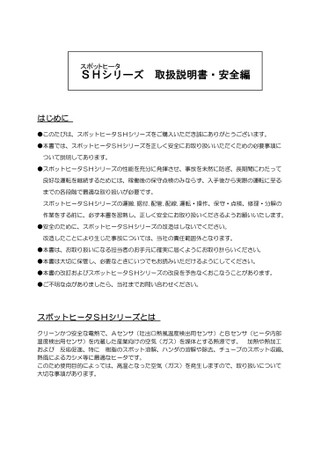 スポットヒータSHシリーズ取扱説明書・安全編はじめに●このたびは、スポットヒータSHシリーズをご購入いただき誠にありがとうございます。●本書では、スポットヒータSHシリーズを正しく安全にお取り扱いいただくための必要事項について説明してあります。●スポットヒータSHシリーズの性能を充分に発揮させ、事故を未然に防ぎ、長期間にわたって良好な運転を継続するためには、稼働後の保守点検のみならず、入手後から実際の運転に至るまでの各段階で最適な取り扱いが必要です。スポットヒータSHシリーズの運搬、据付、配管、配線、運転・操作、保守・点検、修理・分解の作業をする前に、必ず本書を習熟し、正しく安全にお取り扱いくださるようお願いいたします。●安全のために、スポットヒータSHシリーズの改造はしないでください。改造したことにより生じた事故については、当社の責任範囲外となります。●本書は、お取り扱いになる担当者のお手元に確実に届くようにお取り計らいください。●本書は大切に保管し、必要なときにいつでもお読みいただけるようにしてください。●本書の改訂およびスポットヒータSHシリーズの改良を予告なくおこなうことがあります。●ご不明な点がありましたら、当社までお問い合わせください。スポットヒータSHシリーズとはクリーンかつ安全な電熱で、Aセンサ(吐出口熱風温度検出用センサ)とBセンサ(ヒータ内部温度検出用センサ)を内蔵した産業向けの空気(ガス)を媒体とする熱源です。加熱や熱加工および反応促進、特に樹脂のスポット溶解、ハンダの溶解や除去、チューブのスポット収縮、熱風によるカシメ等に最適なヒータです。このため使用目的によっては、高温となった空気(ガス)を発生しますので、取り扱いについて大切な事項があります。