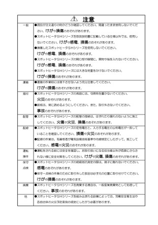 !注意一般●現品が注文通りの物かどうか確認してください。間違ったまま使用しないでください。けがや損傷のおそれがあります。●スポットヒータSHシリーズを取扱説明書に記載している仕様以外では、使用しないでください。けがや感電、損傷のおそれがあります。●損傷したスポットヒータSHシリーズを使用しないでください。けがや感電、損傷のおそれがあります。●スポットヒータSHシリーズの開口部や隙間に、異物や指を入れないでください。けがや感電、損傷のおそれがあります。●スポットヒータSHシリーズには大きな荷重をかけないでください。けがや損傷のおそれがあります。運搬●運搬の作業時には落下させないよう充分注意してください。けがや損傷のおそれがあります。据付●スポットヒータSHシリーズの周囲には、可燃物を置かないでください。火災のおそれがあります。●銘板は、常に読めるようにしてください。また、取り外さないでください。事故のおそれがあります。配管●スポットヒータSHシリーズの配管の接続は、はずれたり漏れのないように施工してください。火傷や火災、損傷のおそれがあります。配線●スポットヒータSHシリーズの定格電圧と、入力する電圧の公称電圧が一致していることを確認してください。損傷や火災のおそれがあります。●配線の作業は、有資格者が電気設備技術基準や内線規定にしたがって、施工してください。感電や火災のおそれがあります。●運転をされる前には安全を確認し、お取り扱いになる担当者以外が危険にさらされない様に安全対策をしてください。けがや火傷、損傷のおそれがあります。●スポットヒータSHシリーズの絶縁抵抗測定の際は、端子に触れないでください。感電のおそれがあります。運転操作保守点検●保守・点検の作業のために取り外した部品は必ず元の位置に取り付けてください。けがや損傷のおそれがあります。廃棄●スポットヒータSHシリーズを廃棄する場合は、一般産業廃棄物として処理してください。事故のおそれがあります。他●スポットヒータSHシリーズを組み込まれる設備によっては、労働安全衛生法や各自治体の火災予防条例の規定にしたがう必要があります。