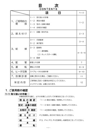 目次CONTENTS項目1.ご使用前の確認2.据え付け1-1取り扱いの手順1-2現品の確認1-3型式・品番の確認1-4合格印の確認2-1設置・取付方法3.結線3ー1内部配線3-2端子配列3-3配線例(1)通常運転(2)ホットスタート運転3-4配線4.配管配管上の注意5.運転運転上の注意6.ヒータ交換スペアヒータの交換手順7.故障診断故障と思われた場合、ご確認ください。保証内容ご使用前に型式・品番を必ず記入してください。メンテナンス時、必要となります。ページ1・22・33・44・5・678・99・1011121.ご使用前の確認1-1取り扱いの手順本機を使用する際に、以下の手順にしたがって作業をおこなってください。現品の確認「1-2現品の確認」を参照してください。型式・品番の確認「1-3型式・品番の確認」を参照してください。合格印の確認「1-4合格印の確認」を参照してください。据え付けP2を参照し取り付けをおこなってください。結運線転P3,P4、P5、P6を参照し結線をおこなってください。ー1-
