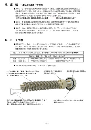 5.運転…運転上の注意(つづき)●スポットヒータの吐出口を大気開放で使用される場合、設置雰囲気に自然の対流程度以上の微風が流れていると、スポットヒータ吐出口からの冷却効果が増してしまい、結果熱風温度の上昇を妨げる可能性があります。特にSH22(600W)を使用される場合には熱風温度が600℃以上昇温しない恐れがありますのでご注意ください。※カタログ記載の《SH22熱風曲線の二点鎖線》部分の温度域が該当します。●SH31を最高温度近辺で使用されている時に、冷却や使用温度を下げるために急激に供給エア量を増量させないでください。ヒータ碍子等が破損します。●SH31のみ、使用中に万一ヒータが断線した場合、スペアヒータの交換ができます。スペアヒータは焼鈍処理をしておりますので、スペアヒータを交換する際はニクロム線には絶対に素手で触れないでください。6.ヒータ交換●使用中に万一、スポットヒータSH31のヒータが断線した場合、ヒータ部の交換がおこなえます。スポットヒータのカタログ(No.6)のオプションパーツを参照し、ヒータ容量を確認のうえ交換をおこなってください。注)スポットヒータSH02・22はヒータ部(スペアヒータ)の交換はできません。SH31専用スペアヒータ型式:SH31S品番:1200-2K…単相200V2000W《付属品》・パッキン(黒)×1・固定ビス×6品番:1200-3K…単相200V3000W・固定ビス用Oリング×6●スペアヒータを取り扱う際は、以下の点にご注意ください。・ニクロム線は決して素手で触らないでください。・ニクロム線に傷や不純物が付着しないよう注意して交換作業をおこなってください。・この部分を持って交換作業を・この部分は持たないでください。おこなってください。・Aセンサの先端は絶縁碍子から約30㎜の位置に調節しています。・必ず付属のパッキンとビス(Oリング付き:6個)をこれ以上に曲げたり、伸ばしたりしないでください。また、破損しないように注意して作業をおこなってください。使用してください。-9-