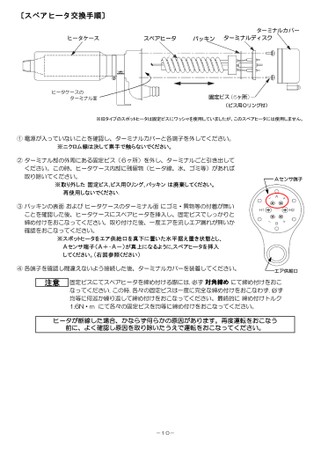 〔スペアヒータ交換手順〕スペアヒータパッキンターミナルディスクヒータケースのターミナル面※旧タイプのスポットヒータは固定ビスにワッシャを使用していましたが、このスペアヒータには使用しません。(ビス用Oリング付)①電源が入っていないことを確認し、ターミナルカバーと各端子を外してください。※ニクロム線は決して素手で触らないでください。②ターミナル部の外周にある固定ビス(6ヶ所)を外し、ターミナルごと引き出してください。この時、ヒータケース内部に残留物(ヒータ線、水、ゴミ等)があれば取り除いてください。※取り外した固定ビス、ビス用Oリング、パッキンは廃棄してください。再使用しないでください.③パッキンの表面およびヒータケースのターミナル面にゴミ・異物等の付着が無いことを確認した後、ヒータケースにスペアヒータを挿入し、固定ビスでしっかりと締め付けをおこなってください。取り付けた後、一度エアを流しエア漏れが無いか確認をおこなってください。※スポットヒータをエア供給口を真下に置いた水平据え置き状態とし、Aセンサ端子(A+・A-)が真上になるように,スペアヒータを挿入してください。(右図参照ください)Aセンサ端子④各端子を確認し間違えないよう接続した後、ターミナルカバーを装着してください。エア供給口注意固定ビスにてスペアヒータを締め付ける際には、必ず対角締めにて締め付けをおこなってください。この時、各々の固定ビスは一度に完全な締め付けをおこなわず、必ず均等に何巡か繰り返して締め付けをおこなってください。最終的に締め付けトルク1.6N・mにて各々の固定ビスを均等に締め付けをおこなってください。ヒータが断線した場合、かならず何らかの原因があります。再度運転をおこなう前に、よく確認し原因を取り除いたうえで運転をおこなってください。-10-