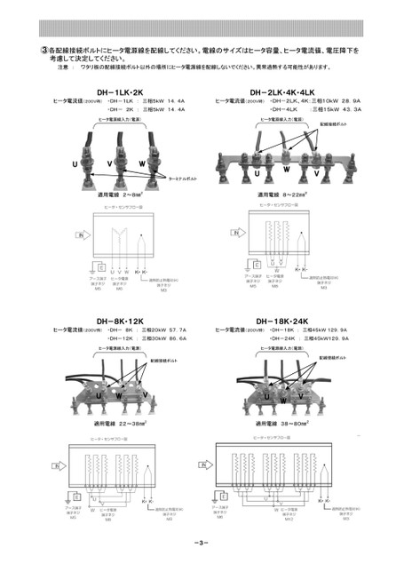 ③各配線接続ボルトにヒータ電源線を配線してください。電線のサイズはヒータ容量、ヒータ電流値、電圧降下を考慮して決定してください。注意:ワタリ板の配線接続ボルト以外の場所にヒータ電源線を配線しないでください。異常過熱する可能性があります。DH-1LK・2KDH-2LK・4K・4LKヒータ電流値(200V時)・DH-1LK:三相5kW14.4Aヒータ電流値(200V時)・DH-2LK、4K:三相10kW28.9A・DH-2K:三相5kW14.4A・DH-4LK:三相15kW43.3Aヒータ電源線入力(電源)ヒータ電源線入力(電源)配線接続ボルトUVWターミナルボルトUWV適用電線2~8㎜2適用電線8~22㎜2DH-8K・12KDH-18K・24Kヒータ電流値(200V時)・DH-8K:三相20kW57.7Aヒータ電流値(200V時)・DH-18K:三相45kW129.9A・DH-12K:三相30kW86.6A・DH-24K:三相45kW129.9Aヒータ電源線入力(電源)ヒータ電源線入力(電源)配線接続ボルト配線接続ボルトUWVUWV適用電線22~38㎜2適用電線38~80㎜2-3-