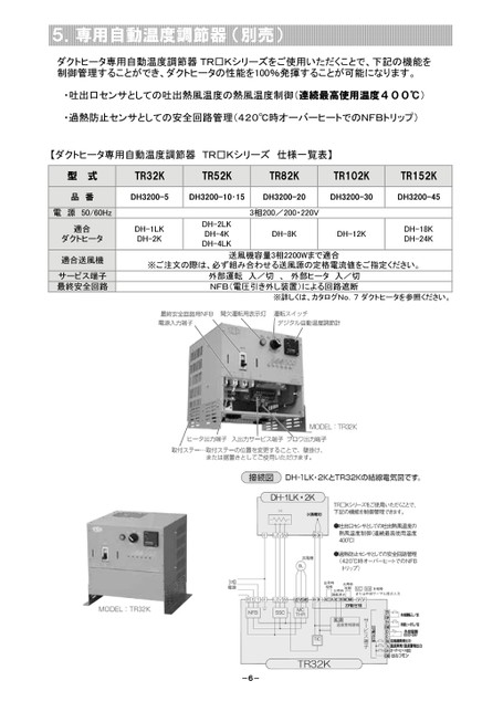 5.専用自動温度調節器(別売)ダクトヒータ専用自動温度調節器TR□Kシリーズをご使用いただくことで、下記の機能を制御管理することができ、ダクトヒータの性能を100%発揮することが可能になります。・吐出口センサとしての吐出熱風温度の熱風温度制御(連続最高使用温度400℃)・過熱防止センサとしての安全回路管理(420℃時オーバーヒートでのNFBトリップ)【ダクトヒータ専用自動温度調節器TR□Kシリーズ仕様一覧表】型式TR32KTR52KTR82KTR102KTR152K品番DH3200-5DH3200-10・15DH3200-20DH3200-30DH3200-45電源50/60Hz3相200/200・220V適合ダクトヒータDH-1LKDH-2KDH-2LKDH-4KDH-4LKDH-8KDH-12KDH-18KDH-24K適合送風機サービス端子最終安全回路※ご注文の際は、必ず組み合わせる送風源の定格電流値をご指定ください。送風機容量3相2200Wまで適合外部運転入/切、外部ヒータ入/切NFB(電圧引き外し装置)による回路遮断※詳しくは、カタログNo.7ダクトヒータを参照ください。-6-