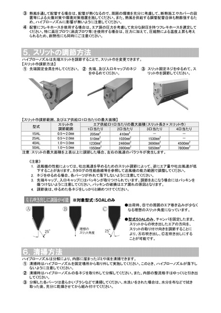 ③④熱風を通して配管する場合は、配管が熱くなるので、周囲の環境を充分に考慮して、断熱施工やカバーの設置等による火傷対策や環境対策措置を施してください。また、熱風を供給する鋼管配管自体も熱膨張するため、ハイブローノズルに影響が無いように注意してください。配管にフレキホースを使用する場合は、エア源の圧力を考慮して充分な耐圧を持つフレキホースを選定してください。特に高圧ブロワ(渦流ブロワ等)を使用する場合は、圧力に加えて、圧縮熱による温度上昇も考えられるため、耐熱性にも同時にご注意ください。5.スリットの調節方法ハイブローノズルは先端スリットを調節することで、スリット巾を変更できます。【スリット巾調節方法】①先端固定金具を外してください。③②先端、及び入口キャップのネジをゆるめてください。スリット固定ネジをゆるめて、スリット巾を調節してください。【スリット巾調節範囲、及びエア供給口1口当たりの最大面積】型式15AL25AL40AL50ALスリット巾調節範囲0.5~2.0㎜0.5~2.0㎜1.0~3.0㎜1.0~5.0㎜エア供給口1口当たりの最大面積(スリット長さ×スリット巾)1口当たり2口当たり3口当たり4口当たり205㎜2510㎜21230㎜21950㎜2410㎜21020㎜22460㎜23900㎜2-1530㎜23690㎜25850㎜2--4500㎜27800㎜2注意:スリットの最大面積を上表以上に調節した場合、左右の風速のバラツキが発生します。《注意》1.2.3.4.送風機の性能によっては、吐出風速を早めるためのスリット調節によって、逆にエア量や吐出風速が低下することがあります。カタログの性能曲線等を参照して送風機の能力範囲で調整してください。ネジをゆるめる場合、各パーツが外れて落下しないように注意してください。先端キャップ、入口キャップにはパッキンが取りつけられています。調節をおこなう場合にはパッキンを傷つけないように注意してください。パッキンの破損はエア漏れの原因となります。調節後は、ゆるめた各ネジをしっかりと締めつけてください。※対象型式:50ALのみ●出荷時、Ⓑでの周囲のエア巻き込みが少なくなる理想のスリット角度になっています。●型式50ALのみ、チャンバを固定したまま、スリットからの吹き出したエアの方向を、スリットの取り付け向きを調節することにより、Ⓐ右吹き出し、Ⓒ左吹き出しにすることが可能です。6.清掃方法ハイブローノズルは分解により、内部に溜まったゴミや埃を清掃できます。①清掃時はハイブローノズルを固定場所から取り外して実施してください。このとき、ハイブローノズルが落下しないように注意してください。②③清掃時はハイブローノズルの各ネジを取り外して分解してください。また、内部の整流格子はゆっくりと引き出してください。分解した各パーツは柔らかいブラシなどで清掃してください。水洗いをされた場合は、水分を布などで拭き取った後、充分に乾燥させてから組み付けてください。