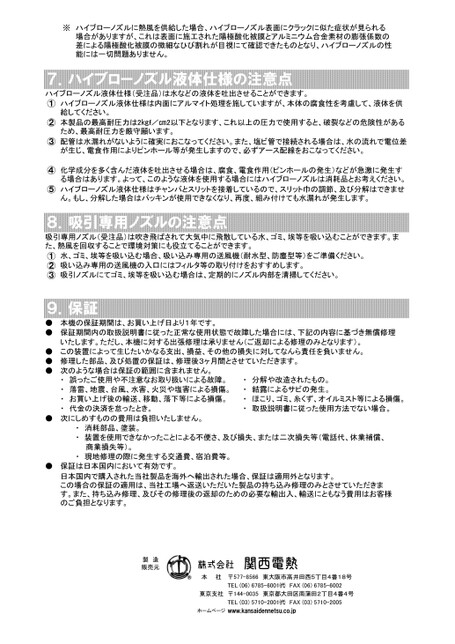 ※ハイブローノズルに熱風を供給した場合、ハイブローノズル表面にクラックに似た症状が見られる場合がありますが、これは表面に施工された陽極酸化被膜とアルミニウム合金素材の膨張係数の差による陽極酸化被膜の微細なひび割れが目視にて確認できたものとなり、ハイブローノズルの性能には一切問題ありません。7.ハイブローノズル液体仕様の注意点ハイブローノズル液体仕様(受注品)は水などの液体を吐出させることができます。①ハイブローノズル液体仕様は内面にアルマイト処理を施していますが、本体の腐食性を考慮して、液体を供給してください。②③④⑤本製品の最高耐圧力は2㎏f/㎝2以下となります、これ以上の圧力で使用すると、破裂などの危険性があるため、最高耐圧力を厳守願います。配管は水漏れがないように確実におこなってください。また、塩ビ管で接続される場合は、水の流れで電位差が生じ、電食作用によりピンホール等が発生しますので、必ずアース配線をおこなってください。化学成分を多く含んだ液体を吐出させる場合は、腐食、電食作用(ピンホールの発生)などが急激に発生する場合はあります。よって、このような液体を使用する場合にはハイブローノズルは消耗品とお考えください。ハイブローノズル液体仕様はチャンバとスリットを接着しているので、スリット巾の調節、及び分解はできません。もし、分解した場合はパッキンが使用できなくなり、再度、組み付けても水漏れが発生します。吸引専用ノズル(受注品)は吹き飛ばされて大気中に飛散している水、ゴミ、埃等を吸い込むことができます。また、熱風を回収することで環境対策にも役立てることができます。水、ゴミ、埃等を吸い込む場合、吸い込み専用の送風機(耐水型、防塵型等)をご準備ください。吸い込み専用の送風機の入口にはフィルタ等の取り付けをおすすめします。吸引ノズルにてゴミ、埃等を吸い込む場合は、定期的にノズル内部を清掃してください。①②③8.吸引専用ノズルの注意点9.保証●●本機の保証期間は、お買い上げ日より1年です。保証期間内の取扱説明書に従った正常な使用状態で故障した場合には、下記の内容に基づき無償修理いたします。ただし、本機に対する出張修理は承りません(ご返却による修理のみとなります)。この装置によって生じたいかなる支出、損益、その他の損失に対してなんら責任を負いません。●●修理した部品、及び処置の保証は、修理後3ヶ月間とさせていただきます。●次のような場合は保証の範囲に含まれません。・誤ったご使用や不注意なお取り扱いによる故障。・落雷、地震、台風、水害、火災や塩害による損傷。・お買い上げ後の輸送、移動、落下等による損傷。・代金の決済を怠ったとき。次にしめすものの費用は負担いたしません。・消耗部品、塗装。●・分解や改造されたもの。・結露によるサビの発生。・ほこり、ゴミ、糸くず、オイルミスト等による損傷。・取扱説明書に従った使用方法でない場合。・装置を使用できなかったことによる不便さ、及び損失、または二次損失等(電話代、休業補償、商業損失等)。・現地修理の際に発生する交通費、宿泊費等。●保証は日本国内において有効です。日本国内で購入された当社製品を海外へ輸出された場合、保証は適用外となります。この場合の保証の適用は、当社工場へ返送いただいた製品の持ち込み修理のみとさせていただきます。また、持ち込み修理、及びその修理後の返却のための必要な輸出入、輸送にともなう費用はお客様のご負担となります。製造販売元株式会社関西電熱本社〒577-8566東大阪市高井田西5丁目4番18号TEL(06)6785-6001㈹FAX(06)6785-6002東京支社〒144-0035東京都大田区南蒲田2丁目4番4号TEL(03)5710-2001㈹FAX(03)5710-2005ホームページwww.kansaidennetsu.co.jp
