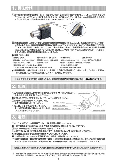 1.据え付け①取手には本体固定用穴(M62ヶ所)を設けています。必要に応じて取手を利用し、しっかりと本体を固定してください。また、オプションにて固定金具(型式:PDL)をご購入いただいた場合は、本体側面の固定金具用取付穴に取り付いているネジ(4ヶ所)を利用し、任意に取り付けてください。②本体の設置方向(上向き、下向き、前後左右傾斜)に制限はありません。ただし、吐出角度が水平より下向きに設置された場合、連続使用可能熱風温度が常温~450℃となりますので、必ずこの温度範囲にてご使用ください。また、取り付け姿勢状態にによっては運転停止時に余熱による影響を受るため、必ず自動冷却運転をおこなうように、本体の停止スイッチ、または外部運転入/切端子にて停止をおこなってください(元電源を遮断した場合、自動冷却運転はおこなわれません)。③設置できない場所・振動のある場所・屋外で風雨にさらされる場所・可燃物の付近・発熱物の上部・周囲温度0~+40℃以外の場所・周囲湿度85%R.H.以上の場所・密閉された部屋、及びケース内・フィルタ面がふさがれる場所・標高1000m以上の場所・気圧の低い場所・酸性ガス、腐食性ガス等が浮遊している場所・通電性浮遊物(カーボン繊維等)のある場所・ほこり、粉塵等の多い場所・パソコン、ラジオ、計測機器等のノイズの影響を受ける場所・幼児が触れる恐れのある場所④熱風運転時に本機が吐出した熱風のはね返り等による熱の影響を受けないように注意してください(オプションにて熱気吸い込み故障防止用吸い込みカバーを用意しています)。吐出角度が水平より下向きに設置した場合、連続使用可能熱風温度範囲は、常温~450℃となります。2.配管①配管おこなう場合は、必ずPDF65合フランジアダプタを利用してください。熱風吐出口に直接配管しないでください。②PDF65合フランジアダプタはバンドでしっかりと固定してください。③配管はできるだけ短くしてください。また、配管を極端に絞らないでください。④吸入口、吐出口をふさがないでください。ホース配管は熱風が漏れないようにバンドでしっかりと締め付けてください。合フランジ4FD383.電源①ポータブルドライヤの電源電圧にあった専用電源を用意してください。②100V電源の機種は同じコンセントの電源で他の機器と同時に使用しないでください。③延長コードを使用される場合は電圧降下を考慮してください。④200V(230V:海外用)電源の機種は必ずアース工事(300V以下:D種接地)をしてください。⑤他の機器と連動させて高頻度で電源を入り切りしないでください。⑥日本国内用(100V・200V電源機種)は日本国外では使用しないでください。⑦本機には運転停止操作時に内部温度に対応した自動冷却運転機能が装備されています。これは元電源の遮断時には作動しませんので、元電源の遮断による運転停止をおこなうような回路を組まないでください。元電源を遮断して本機を停止した場合、自動冷却運転機能が作動せず、余熱による故障の原因となります。※単相三線式の低圧配電方式にて単相100V電源をご使用の場合は、分電盤より容易に単相200Vの電源を取り出すことができます。単相200V機種をご使用の場合は、電源容量も含め、電気工事士にご相談いただきますよう、お願い申し上げます。-1-