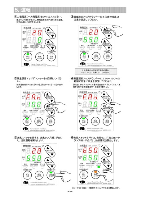5.運転①工場電源(一次側電源)をONにしてください。停止ランプ(緑)が点灯し、熱風温度指示PV部に現在温度、設定SV部に『0』が表示します。②温度設定アップダウンキーにて任意の吐出口温度を設定してください。吐出角度が水平より下向きの場合、450℃以上に設定しないでください。③風量調節アップダウンキーを1回押してください。④風量調節アップダウンキーにて70~100%の範囲で任意に風量を設定してください。熱風温度指示PV部に『FAN』、設定SV部に『100』が表示します。設定後、停止スイッチにて通常温度表示へ戻してください(無操作5秒で通常温度表示へ自動切り替わり)。⑤送風スイッチを押すと、送風ランプ(緑)が点灯し、送風運転を開始します。⑥熱風スイッチを押すと、熱風ランプ(橙)とヒータランプ(緑)が点灯し、熱風運転を開始します。※ヒータランプはヒータ制御のタイミングで点滅を開始します。-3-