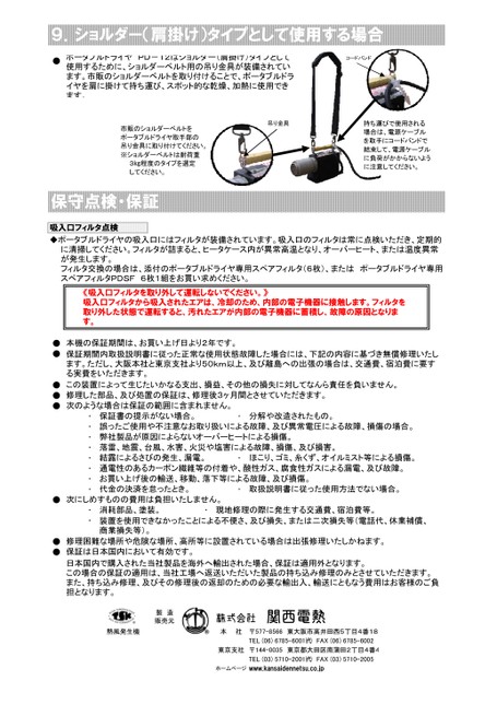 市販のショルダーベルトをポータブルドライヤ取手部の吊り金具に取り付けてください。※ショルダーベルトは耐荷重3㎏程度のタイプを選定してください。吊り金具持ち運びで使用される場合は、電源ケーブルを取手にコードバンドで結束して、電源ケーブルに負荷がかからないように注意してください。◆ポータブルドライヤの吸入口にはフィルタが装備されています。吸入口のフィルタは常に点検いただき、定期的に清掃してください。フィルタが詰まると、ヒータケース内が異常高温となり、オーバーヒート、または温度異常が発生します。フィルタ交換の場合は、添付のポータブルドライヤ専用スペアフィルタ(6枚)、またはポータブルドライヤ専用スペアフィルタPDSF6枚1組をお買い求めください。《吸入口フィルタを取り外して運転しないでください。》吸入口フィルタから吸入されたエアは、冷却のため、内部の電子機器に接触します。フィルタを取り外した状態で運転すると、汚れたエアが内部の電子機器に蓄積し、故障の原因となります。本機の保証期間は、お買い上げ日より2年です。保証期間内取扱説明書に従った正常な使用状態故障した場合には、下記の内容に基づき無償修理いたします。ただし、大阪本社と東京支社より50km以上、及び離島への出張の場合は、交通費、宿泊費に要する実費をいただきます。この装置によって生じたいかなる支出、損益、その他の損失に対してなんら責任を負いません。修理した部品、及び処置の保証は、修理後3ヶ月間とさせていただきます。次のような場合は保証の範囲に含まれません。●●●●●保守点検・保証吸入口フィルタ点検9.ショルダー(肩掛け)タイプとして使用する場合●ポータブルドライヤPD-12はショルダー(肩掛け)タイプとして使用するために、ショルダーベルト用の吊り金具が装備されています。市販のショルダーベルトを取り付けることで、ポータブルドライヤを肩に掛けて持ち運び、スポット的な乾燥、加熱に使用できます。コードバンド・・・・・・・・・分解や改造されたもの。保証書の提示がない場合。誤ったご使用や不注意なお取り扱いによる故障、及び異常電圧による故障、損傷の場合。弊社製品が原因によらないオーバーヒートによる損傷。落雷、地震、台風、水害、火災や塩害による故障、損傷、及び損害。結露によるさびの発生、漏電。通電性のあるカーボン繊維等の付着や、酸性ガス、腐食性ガスによる漏電、及び故障。お買い上げ後の輸送、移動、落下等による故障、及び損傷。代金の決済を怠ったとき。取扱説明書に従った使用方法でない場合。ほこり、ゴミ、糸くず、オイルミスト等による損傷。・・・・消耗部品、塗装。装置を使用できなかったことによる不便さ、及び損失、または二次損失等(電話代、休業補償、商業損失等)。現地修理の際に発生する交通費、宿泊費等。・日本国内で購入された当社製品を海外へ輸出された場合、保証は適用外となります。この場合の保証の適用は、当社工場へ返送いただいた製品の持ち込み修理のみとさせていただきます。また、持ち込み修理、及びその修理後の返却のための必要な輸出入、輸送にともなう費用はお客様のご負担となります。修理困難な場所や危険な場所、高所等に設置されている場合は出張修理いたしかねます。保証は日本国内において有効です。●●製造販売元株式会社関西電熱熱風発生機本社〒577-8566東大阪市高井田西5丁目4番18号TEL(06)6785-6001㈹FAX(06)6785-6002東京支社〒144-0035東京都大田区南蒲田2丁目4番4TEL(03)5710-2001㈹FAX(03)5710-2005ホームページwww.kansaidennetsu.co.jp●次にしめすものの費用は負担いたしません。