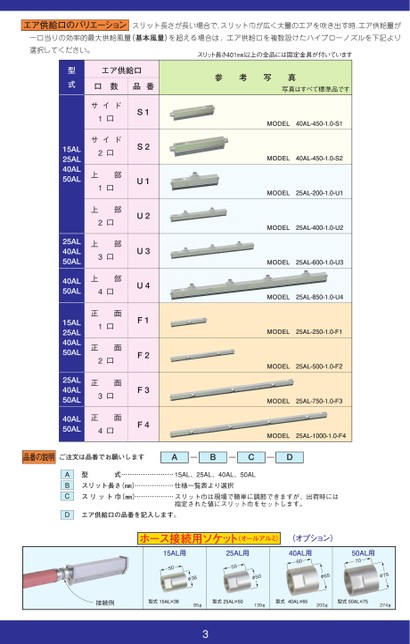 エア供給口のバリエーションエア供給口口数品番写真はすべて標準品ですMODEL40AL-450-1.0-S1MODEL40AL-450-1.0-S2MODEL25AL-200-1.0-U1MODEL25AL-400-1.0-U2MODEL25AL-600-1.0-U3MODEL25AL-850-1.0-U4MODEL25AL-250-1.0-F1MODEL25AL-500-1.0-F2MODEL25AL-750-1.0-F3MODEL25AL-1000-1.0-F4品番の説明エア供給口の品番を記入します。します。ホース接続用ソケット(オールアルミ)(オプション)15AL用05φ3825AL用55φ5040AL用0650AL用07φ65φ75型式15AL×3885g型式25AL×50139g型式40AL×65203g型式50AL×75274g
