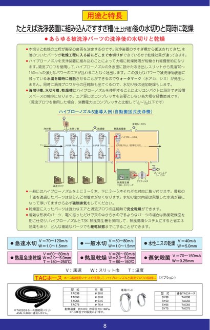 用途と特長ハイブローノズルを洗浄装置に組み込むことによって大幅に乾燥時間が短縮され経費節約になり大幅浄水槽水切り室乾燥室熱風乾燥室排気5〜10%ハイブローノズルラインスピード30m/min吐出風速100m/s吐出風速100m/s吐出風速50m/s熱風温度120℃渦流ブロワフレッシュエア5〜10%熱風発生機TSK-CシリーズデミフィルタV=70〜120m/sW=1.0〜1.5mmV=60〜80m/sW=2.0〜5.0mmT=150〜250℃V=50〜80m/sW=1.0〜1.5mmV=20〜60m/sW=2.0〜5.0mmT=60〜150℃V=40m/sW=5.0mmV=70〜150m/sW=0.25mmTACホースホース接続用ソケットを使用して、ハイブローノズルと渦流ブロワの接続に(オプション)型式TAC38TAC50TAC65TAC75内径φ38.0φ50.8φ63.5φ76.4型式SY38SY50SY65SY75適合TACホースTAC38TAC50TAC65TAC75