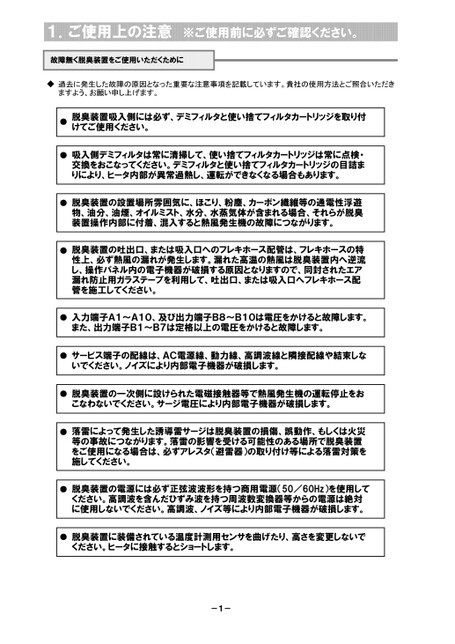 1.ご使用上の注意※ご使用前に必ずご確認ください。故障無く脱臭装置をご使用いただくために◆過去に発生した故障の原因となった重要な注意事項を記載しています。貴社の使用方法とご照合いただきますよう、お願い申し上げます。●脱臭装置吸入側には必ず、デミフィルタと使い捨てフィルタカートリッジを取り付けてご使用ください。●吸入側デミフィルタは常に清掃して、使い捨てフィルタカートリッジは常に点検・交換をおこなってください。デミフィルタと使い捨てフィルタカートリッジの目詰まりにより、ヒータ内部が異常過熱し、運転ができなくなる場合もあります。●脱臭装置の設置場所雰囲気に、ほこり、粉塵、カーボン繊維等の通電性浮遊物、油分、油煙、オイルミスト、水分、水蒸気体が含まれる場合、それらが脱臭装置操作内部に付着、混入すると熱風発生機の故障につながります。●脱臭装置の吐出口、または吸入口へのフレキホース配管は、フレキホースの特性上、必ず熱風の漏れが発生します。漏れた高温の熱風は脱臭装置内へ逆流し、操作パネル内の電子機器が破損する原因となりますので、同封されたエア漏れ防止用ガラステープを利用して、吐出口、または吸入口へフレキホース配管を施工してください。●入力端子A1~A10、及び出力端子B8~B10は電圧をかけると故障します。また、出力端子B1~B7は定格以上の電圧をかけると故障します。●サービス端子の配線は、AC電源線、動力線、高調波線と隣接配線や結束しないでください。ノイズにより内部電子機器が破損します。●脱臭装置の一次側に設けられた電磁接触器等で熱風発生機の運転停止をおこなわないでください。サージ電圧により内部電子機器が破損します。●落雷によって発生した誘導雷サージは脱臭装置の損傷、誤動作、もしくは火災等の事故につながります。落雷の影響を受ける可能性のある場所で脱臭装置をご使用になる場合は、必ずアレスタ(避雷器)の取り付け等による落雷対策を施してください。●脱臭装置の電源には必ず正弦波波形を持つ商用電源(50/60Hz)を使用してください。高調波を含んだひずみ波を持つ周波数変換器等からの電源は絶対に使用しないでください。高調波、ノイズ等により内部電子機器が破損します。●脱臭装置に装備されている温度計測用センサを曲げたり、高さを変更しないでください。ヒータに接触するとショートします。-1-