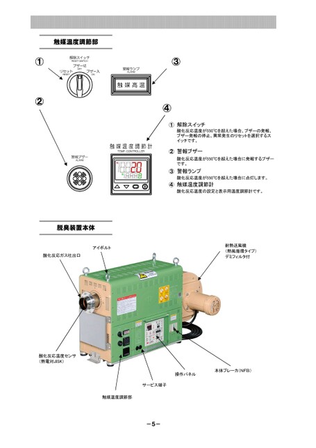触媒温度調節部①②③④①解除スイッチ酸化反応温度が550℃を超えた場合、ブザーの発報、ブザー発報の停止、異常発生のリセットを選択するスイッチです。②警報ブザー酸化反応温度が550℃を超えた場合に発報するブザーです。③警報ランプ酸化反応温度が550℃を超えた場合に点灯します。④触媒温度調節計酸化反応温度の設定と表示用温度調節計です。脱臭装置本体酸化反応ガス吐出口アイボルト耐熱送風機(熱風循環タイプ)デミフィルタ付酸化反応温度センサ(熱電対JISK)操作パネル本体ブレーカ(NFB)サービス端子触媒温度調節部-5-