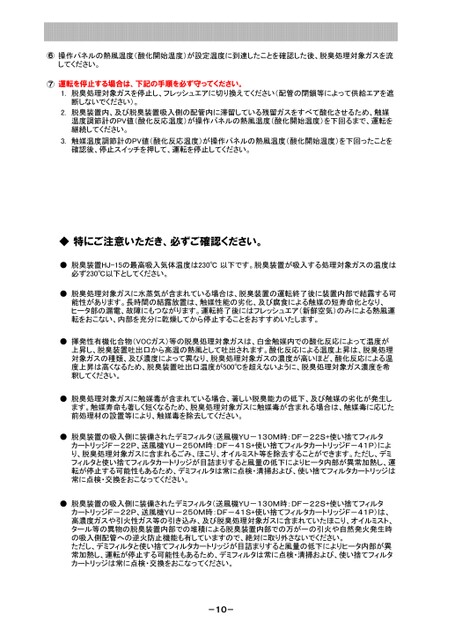 ⑥操作パネルの熱風温度(酸化開始温度)が設定温度に到達したことを確認した後、脱臭処理対象ガスを流してください。⑦運転を停止する場合は、下記の手順を必ず守ってください。1.2.3.脱臭処理対象ガスを停止し、フレッシュエアに切り換えてください(配管の閉鎖等によって供給エアを遮断しないでください)。脱臭装置内、及び脱臭装置吸入側の配管内に滞留している残留ガスをすべて酸化させるため、触媒温度調節計のPV値(酸化反応温度)が操作パネルの熱風温度(酸化開始温度)を下回るまで、運転を継続してください。触媒温度調節計のPV値(酸化反応温度)が操作パネルの熱風温度(酸化開始温度)を下回ったことを確認後、停止スイッチを押して、運転を停止してください。◆特にご注意いただき、必ずご確認ください。●脱臭装置HJ-15の最高吸入気体温度は230℃以下です。脱臭装置が吸入する処理対象ガスの温度は必ず230℃以下としてください。●●脱臭処理対象ガスに水蒸気が含まれている場合は、脱臭装置の運転終了後に装置内部で結露する可能性があります。長時間の結露放置は、触媒性能の劣化、及び腐食による触媒の短寿命化となり、ヒータ部の漏電、故障にもつながります。運転終了後にはフレッシュエア(新鮮空気)のみによる熱風運転をおこない、内部を充分に乾燥してから停止することをおすすめいたします。揮発性有機化合物(VOCガス)等の脱臭処理対象ガスは、白金触媒内での酸化反応によって温度が上昇し、脱臭装置吐出口から高温の熱風として吐出されます。酸化反応による温度上昇は、脱臭処理対象ガスの種類、及び濃度によって異なり、脱臭処理対象ガスの濃度が高いほど、酸化反応による温度上昇は高くなるため、脱臭装置吐出口温度が500℃を超えないように、脱臭処理対象ガス濃度を希釈してください。●脱臭処理対象ガスに触媒毒が含まれている場合、著しい脱臭能力の低下、及び触媒の劣化が発生します。触媒寿命も著しく短くなるため、脱臭処理対象ガスに触媒毒が含まれる場合は、触媒毒に応じた前処理材の設置等により、触媒毒を除去してください。●●脱臭装置の吸入側に装備されたデミフィルタ(送風機YU-130M時:DF-22S+使い捨てフィルタカートリッジF-22P、送風機YU-250M時:DF-41S+使い捨てフィルタカートリッジF-41P)により、脱臭処理対象ガスに含まれるごみ、ほこり、オイルミスト等を除去することができます。ただし、デミフィルタと使い捨てフィルタカートリッジが目詰まりすると風量の低下によりヒータ内部が異常加熱し、運転が停止する可能性もあるため、デミフィルタは常に点検・清掃および、使い捨てフィルタカートリッジは常に点検・交換をおこなってください。脱臭装置の吸入側に装備されたデミフィルタ(送風機YU-130M時:DF-22S+使い捨てフィルタカートリッジF-22P、送風機YU-250M時:DF-41S+使い捨てフィルタカートリッジF-41P)は、高濃度ガスや引火性ガス等の引き込み、及び脱臭処理対象ガスに含まれていたほこり、オイルミスト、タール等の異物の脱臭装置内部での堆積による脱臭装置内部での万が一の引火や自然発火発生時の吸入側配管への逆火防止機能も有していますので、絶対に取り外さないでください。ただし、デミフィルタと使い捨てフィルタカートリッジが目詰まりすると風量の低下によりヒータ内部が異常加熱し、運転が停止する可能性もあるため、デミフィルタは常に点検・清掃および、使い捨てフィルタカートリッジは常に点検・交換をおこなってください。-10-