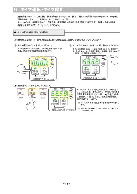 9.タイマ運転・タイマ停止脱臭装置はタイマによる運転、停止が可能となりますが、停止に関しては安全のための手順(P.10参照)があるため、タイマによる停止はおこなわないでください。また、タイマによる運転をおこなう場合も、運転開始から酸化反応温度が設定温度に到達するまで脱臭処理対象ガスが流れないようにしてください。●タイマ運転(時間がたてば運転)①運転停止状態にて、酸化開始温度、酸化反応温度、風量の各設定をおこなってください。②タイマ運転スイッチを押してください。③アップダウンキーで任意の時間に設定してください。タイマ運転ランプ(緑)が点灯し、タイマ表示部に『00.00.』が点滅、または前回の設定時間が点灯します。最長99時間59分まで1分単位で設定できます。設定完了後、アップダウンキーから手を離すと、2秒後に点滅から点灯に切り替わり、設定値が登録されます。④熱風運転スイッチを押してください。タイムカウント(タイマ設定時間減算)が開始され(ドット表示点滅)、タイムカウントが『00.00』になると熱風運転を開始します。また、タイムカウント中は熱風ランプ(橙)は点滅し、熱風運転開始後、点灯に切り替わります。※タイムカウント終了後、タイマ表示は『00.00.』となります。※停止スイッチを押すと、タイマ運転、及びタイムカウントは停止します。-12-