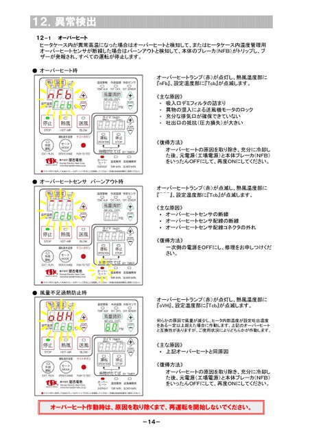 12.異常検出12-1オーバーヒートヒータケース内が異常高温になった場合はオーバーヒートと検知して、またはヒータケース内温度管理用オーバーヒートセンサが断線した場合はバーンアウトと検知して、本体のブレーカ(NFB)がトリップし、ブザーが発報され、すべての運転が停止します。●オーバーヒート時オーバーヒートランプ(赤)が点灯し、熱風温度部に『nFb』、設定温度部に『Tcb』が点滅します。吸入口デミフィルタの詰まり異物の混入による送風機モータのロック充分な排気口が確保できていない吐出口の抵抗(圧力損失)が大きい・・・・《主な原因》《復帰方法》オーバーヒートの原因を取り除き、充分に冷却した後、元電源(工場電源)と本体ブレーカ(NFB)をいったんOFFにして、再度ONにしてください。オーバーヒートランプ(赤)が点滅し、熱風温度部に『---』、設定温度部に『Tcb』が点滅します。オーバーヒートセンサの断線オーバーヒートセンサ配線の断線オーバーヒートセンサ配線コネクタの外れ・・・《主な原因》《復帰方法》一次側の電源をOFFにし、修理をお申しつけください。オーバーヒートランプ(赤)が点灯し、熱風温度部に『oVH』、設定温度部に『Tcb』が点滅します。何らかの原因で風量が減少し、ヒータ内部温度が設定吐出温度をある一定以上超えた場合に作動します。上記のオーバーヒートと互換性がありますが、ご使用状況によりどちらかが作動します。《主な原因》・上記オーバーヒートと同原因《復帰方法》オーバーヒートの原因を取り除き、充分に冷却した後、元電源(工場電源)と本体ブレーカ(NFB)をいったんOFFにして、再度ONにしてください。●オーバーヒートセンサバーンアウト時●風量不足過熱防止時オーバーヒート作動時は、原因を取り除くまで、再運転を開始しないでください。-14-