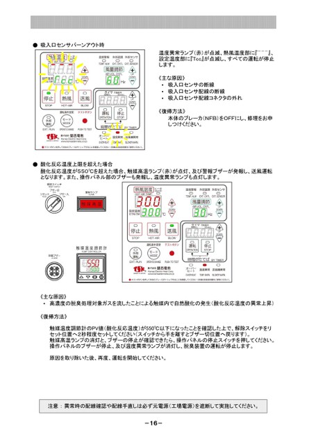 温度異常ランプ(赤)が点滅、熱風温度部に『---』、設定温度部に『Tcc』が点滅し、すべての運転が停止します。《復帰方法》本体のブレーカ(NFB)をOFFにし、修理をお申しつけください。吸入口センサの断線吸入口センサ配線の断線吸入口センサ配線コネクタの外れ・・・《主な原因》●吸入口センサバーンアウト時●酸化反応温度上限を超えた場合酸化反応温度が550℃を超えた場合、触媒高温ランプ(赤)が点灯、及び警報ブザーが発報し、送風運転となります。また、操作パネル部のブザーも発報し、温度異常ランプも点灯します。《主な原因》・高濃度の脱臭処理対象ガスを流したことによる触媒内で自然酸化の発生(酸化反応温度の異常上昇)《復帰方法》触媒温度調節計のPV値(酸化反応温度)が550℃以下になったことを確認した上で、解除スイッチをリセット位置へ2秒程度セットしてください(スイッチから手を離すとブザー切位置へ戻ります)。触媒高温ランプの消灯と、ブザーの停止が確認できたら、操作パネルの停止スイッチを押してください。操作パネルのブザーが停止、及び温度異常ランプが消灯し、脱臭装置の運転が停止します。原因を取り除いた後、再度、運転を開始してください。注意:異常時の配線確認や配線手直しは必ず元電源(工場電源)を遮断して実施してください。-16-