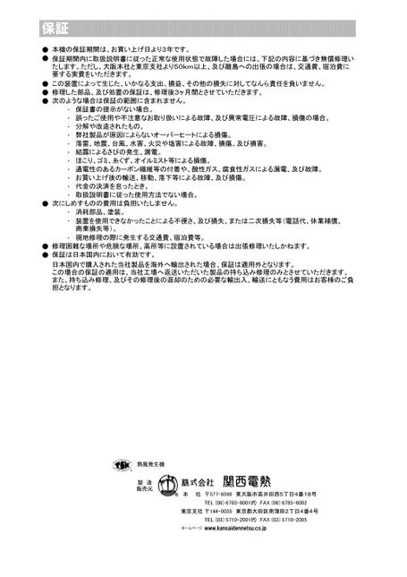 本機の保証期間は、お買い上げ日より3年です。保証期間内に取扱説明書に従った正常な使用状態で故障した場合には、下記の内容に基づき無償修理いたします。ただし、大阪本社と東京支社より50km以上、及び離島への出張の場合は、交通費、宿泊費に要する実費をいただきます。この装置によって生じた、いかなる支出、損益、その他の損失に対してなんら責任を負いません。修理した部品、及び処置の保証は、修理後3ヶ月間とさせていただきます。次のような場合は保証の範囲に含まれません。●●●●●・・・・・・・・・・・保証書の提示がない場合。誤ったご使用や不注意なお取り扱いによる故障、及び異常電圧による故障、損傷の場合。分解や改造されたもの。弊社製品が原因によらないオーバーヒートによる損傷。落雷、地震、台風、水害、火災や塩害による故障、損傷、及び損害。結露によるさびの発生、漏電。ほこり、ゴミ、糸くず、オイルミスト等による損傷。通電性のあるカーボン繊維等の付着や、酸性ガス、腐食性ガスによる漏電、及び故障。お買い上げ後の輸送、移動、落下等による故障、及び損傷。代金の決済を怠ったとき。取扱説明書に従った使用方法でない場合。・・・消耗部品、塗装。装置を使用できなかったことによる不便さ、及び損失、または二次損失等(電話代、休業補償、商業損失等)。現地修理の際に発生する交通費、宿泊費等。日本国内で購入された当社製品を海外へ輸出された場合、保証は適用外となります。この場合の保証の適用は、当社工場へ返送いただいた製品の持ち込み修理のみとさせていただきます。また、持ち込み修理、及びその修理後の返却のための必要な輸出入、輸送にともなう費用はお客様のご負担となります。修理困難な場所や危険な場所、高所等に設置されている場合は出張修理いたしかねます。保証は日本国内において有効です。●●●次にしめすものの費用は負担いたしません。保証熱風発生機製造販売元本社〒577-8566東大阪市高井田西5丁目4番18号TEL(06)6785-6001㈹FAX(06)6785-6002東京支社〒144-0035東京都大田区南蒲田2丁目4番4号TEL(03)5710-2001㈹FAX(03)5710-2005ホームページwww.kansaidennetsu.co.jp