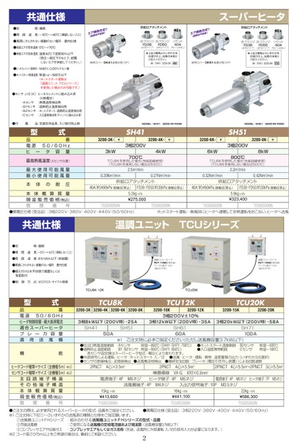 ●異電圧仕様(受注品):3相220V・380V・400V・440V(50/60Hz)ホットスタート運転…無風時にヒータへ通電して余熱運転をおこない、ヒータへ送風する共通仕様温調ユニットTCUシリーズ●定格:連続●周●周囲囲温湿度:-5℃〜+40℃(凍結しないこと)度:85%R.H.以下(非結露)●風雨にさらされない振動のない場所屋内仕様●据え付けは水平状態で据置もしくは背面取付●制御方式:ゼロクロス・サイクル制御遠隔コントーローラRCT-10MC(受注品)ケーブル長さ:10m(後付け不可)遠隔コントーローラRCT-10MC(受注品)ケーブル長さ:10m(後付け不可)型式品番電源50/60Hzヒータ制御容量・最大負荷電流適合スーパーヒータブ量機適レーカ容用送風機能TCU8K・12KTCU8K3200-3K3200-4K3200-6K3200-8K3相8kW以下(200V時)・25ASH41SH5150ATCU20KTCU12K3200-10K3200-12K3相200V±10%3相12kW以下(200V時)・35ASH6160ATCU20K3200-15K3200-20K3相20kW以下(200V時)・58ASH71100A※1ご注文時に必ずご指定ください(ただし送風機容量3.7kW以下)●吐出口熱風温度範囲:Aセンサ●過熱防止温度範囲各センサ設定値はスーパーヒータ型式・電圧により変わります。●外部信号による運転・ヒータ・ホットスタート入/切●送風・ヒータ・運転・異常・温度警報の出力(いずれか3点選択)●センサの断線検出・逆接続検出●送風機逆相検出●最終安全回路:ブレーカ(電圧引き外し装置)による回路遮断●ホットスタート温度範囲:B2センサ●入口温度異常範囲:Cセンサ:B1・B2センサ常温〜950℃(SH71:850℃)常温〜800℃(SH41・SH71:700℃)常温〜500℃常温〜100℃ヒータコード種類×サイズ(全機種5m)※2センサコード種類×サイズ(全機種5m)※22PNCT4心×3.5mm22PNCT4心×5.5mm2補償導線VX-G4対×0.3mm22PNCT4心×5.5mm2+2PNCT3心×5.5mm2路他子子端端回の体構構質造主造そ本量現金販売価格(税込)管号概算理番電源端子:4PM6ネジヒータ端子:4PM5ネジ電源端子:4PM6ネジヒータ端子:7PM5ネジ送風機端子:4PM4ネジ入出力信号端子:10PM3.5ネジ15kg±5%¥355,300TIS00S000N16kg±5%¥378,400TIS00S000N22kg±5%¥504,900TIS00S000N●ご注文の際は、必ず使用されるスーパーヒータの型式・品番をご指定ください。●異電圧仕様(受注品):3相220V・380V・400V・440V(50/60Hz)※1ご注文時に下記①〜③いずれかの送風源の種類と仕様をご指定願います。①送風機ユニットFHシリーズ:組み合わせる送風機ユニットFHシリーズの型式・品番②市販送風機③コンプレッサエアや圧縮ガス※2コード長さが5m以上をご希望の場合は、事前にご相談ください。:ご使用になる送風機の定格電流値および周波数(送風機容量3.7kW以下):コンプレッサエアもしくはガス名称(別途、送風時に外部運転入/切の信号入力が必要になります。)2共通仕様●定格:連続●周囲温度:ー10℃〜+40℃(凍結しないこと)●風雨にさらされない振動のない場所屋内仕様エア断熱方式!!(断熱材不使用)スーパーヒータ供給口アタッチメントエア断熱方式!!(断熱材不使用)供給口アタッチメント合フランジ合フランジFD38FD50ソケット40A(φ38パイプ)(φ50パイプ)(Rp11/2めねじ)合フランジ合フランジFD38FD50ソケット40A(φ38パイプ)(φ50パイプ)(Rp11/2めねじ)断熱カバーDK41装着状態(OP)※上記3種類よりいずれかをお選びの上、品番の末尾にご記入ください。例:SH413200-3K-40A断熱カバーDK51装着状態(OP)※上記3種類よりいずれかをお選びの上、品番の末尾にご記入ください。例:SH513200-6K-FD38MODEL:SH413200-4K-FD38MODEL:SH513200-8K-FD503200-3K-※3kW3200-4K-※3200-6K-※4kW6kWSH413相200V700℃SH513相200V800℃3200-8K-※8kWTCU8Kを使用した場合(性能曲線参照)(TCU8Kを使用しない場合は500℃)TCU8Kを使用した場合(性能曲線参照)(TCU8Kを使用しない場合は500℃)2.5m3/min2.2m3/min0.20Nm3/min0.27Nm3/min供給口アタッチメント0.32Nm3/min0.42Nm3/min供給口アタッチメント40A:約490kPa(脈動圧禁止)FD38・FD50:約30kPa(脈動圧禁止)40A:約490kPa(脈動圧禁止)FD38・FD50:約30kPa(脈動圧禁止)5.2kg±5%¥237,6005.9kg±5%¥278,300TIS00S000NTIS00S000NTIS00S000NTIS00S000N●供給エアの気体湿度:温度40℃で湿度90%以下(常圧〜高圧下のもとで、結露しないエアを供給してください。)●ヒータエレメント(発熱体):Ni80%Cr20%ラセン巻●ホットスタート熱風温度:常温+α〜500℃以下(ホットスタート運転は「温調ユニットTCUシリーズ」を使用した場合のみ可能です。)センサJIS〔K〕ヒータエレメントに組み込み済:熱風温度検出用(K熱電対)・Aセンサ・B1センサ:過熱防止温度検出用・B2センサ:ホットスタート、過熱防止温度検出用・Cセンサ:入口温度検出用(チャンバに組み込み済)●●供給エアの気体温度:0℃〜+70℃●付属品:先端支持金具、ネジ焼付防止剤型式品番電源50/60Hzヒ量ータ容最高熱風温度(Aセンサ位置)最大使用可能風量最小使用可能風量本体の耐圧質算概体本量現金販売価格(税込)号管理番