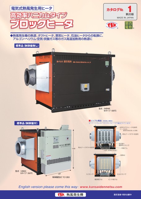 電気式熱風発生用ヒータ1第20版MADEINJAPAN◆熱風発生機の熱源、ダクトヒータ、蒸気ヒータ、石油ヒータからの転換に、アルゴン・ヘリウム・空気・炭酸ガス等のガス高温加熱用の熱源に標準品(制御盤無し)標準品(制御盤付)■シンプル構造MODEL8BS4すべてハニカムタイプのブロックヒータで構成されています。型式24BW6Wタイプ:500℃定評のダクトヒータを使用(ヒータ本体に断熱材を取り除いた写真)角丸テーパダクトを使用1220内部に断熱材を施工角丸テーパダクトを使用各回路に過熱防止センサ防振ゴム断熱材型式12BS3Sタイプ:350℃290制御盤型式TC12B3入口センサ吐出口センサ電源端子台センサ端子台www.kansaidennetsu.com