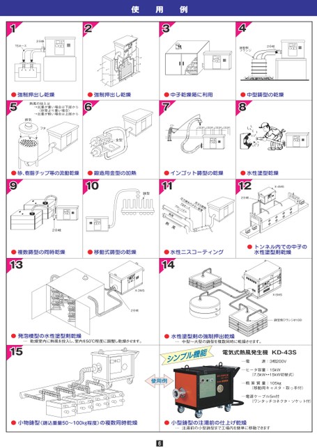 2分岐TSホース鋳型側フランジ2分岐熱風の投入は→比重が重い場合は下部から(砂等より重い場合)→比重が軽い場合は上部から排気フタ金型2分岐鋳型X-4MS2分岐X-3MS2分岐X-5MS鋳型側フランジφ100シンプル機能使用例電気式熱風発生機KD-43S…電源:3相200V…ヒータ容量:15kW(7.5kW15kW切替式)…概算質量:105㎏(移動用キャスタ・取っ手付)…電源ケーブル5m付(ワンタッチコネクタ・ソケット付)●小物鋳型(鋳込重量50〜100㎏程度)の複数同時乾燥●小型鋳型の注湯前の仕上げ乾燥…注湯前の小型鋳型まで工場内を簡単に移動できます