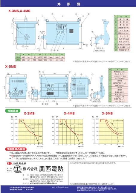 名称熱風吐出口125A吸入口フィルタフィルタメンテパネルアイボルトM24操作盤操作盤内用フィルタELB(ブレーカ)風圧計差圧計風量換算グラフ電源コードフック下向90°エルボ電源端子台カバーマルチ分岐ヘッド№①②③④⑤⑥⑦⑧⑨⑩⑪⑫⑬⑭本製品の外形図データは当社ホームページからダウンロードできます。名称操作盤風圧計差圧計風量換算グラフ吊り金具電源コードフックフィルタ3MSDF-55S4MSDF-81S熱風吐出口125Aホース専用合フランジ下向90°エルボ①②③④⑤⑥⑦⑧⑨⑩C105⑨②③④G100201.5Cφ250(フランジ)①40D⑤⑥40⑩A41電源コード5mJIS125A(5K)φ10090E12030H100⑦⑧FBX-5MS1451050④⑤1750⑦⑬③⑪本製品の外形図データは当社ホームページからダウンロードできます。200152φ250(フランジ)⑫2804014010001222505121700⑧⑥⑨⑩②℃停止S熱風HT送風BL運モド替自手ヒー容切3k4W送運転間①⑭約8601312173263320X-3MS76dB静圧kPa6.0温度℃300X-4MSX-5MS静圧kPa4.50温度℃3003.752503.002002.251501.501000.7550インバータ出力100%の時5.025079dBインバータ出力100%の時74dB4.02003.01502.01001.050078dB45kW74dB2530風量K/min0510152030kW69dB2024風量K/min00481216静圧kPa9.0温度℃3007.52506.02004.51503.01001.5500インバータ出力100%の時78dB72kW60kW010203040風量K/min熱風発生機このカタログの記載内容は2021年9月1日現在のものです。本社東京支社ホームページ〒577-8566東大阪市高井田西5丁目4番18号1(06)6785-6001㈹FAX(06)6785-6002〒144-0035東京都大田区南蒲田2丁目4番4号1(03)5710-2001㈹FAX(03)5710-2005www.kansaidennetsu.co.jp2021.07Ⓢ5,000㉔(奥田)この印刷物を無断転載、無断使用することはお断りします。