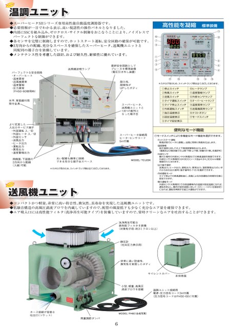 ⑪⑫⑨⑤④高性能を凝縮標準装備⑩⑦⑧①②③⑥⑰⑯⑬⑭⑮※カタログ用のため、スイッチ・ランプ類は全て点灯しております。①停止スイッチ②熱風スイッチ③送風スイッチ④タイマ運転スイッチ⑤タイマ停止スイッチ⑥外部運転スイッチ⑦指示温度表示⑧設定温度表示⑨タイマ設定表示⑩ヒータランプ⑪温度警報ランプ⑫外部センサランプ⑬オーバーヒートランプ⑭温度異常ランプ⑮送風機異常ランプ⑯テストボタン⑰モードスイッチ便利なモード機能⑰モードスイッチにより多機能なモード機能を選択できます。(偏差および絶対値での上限・下限・上下限、待機付き・無しを選択可)・ホットスタート運転無風状態でヒータに通電し、送風と同時に熱風を吐出します。・温度警報指示温度に対しての上下限温度警報を出力します。・外部センサ離れた場所の外部センサ(K熱電対)での熱風温度を制御できます。外部センサ(K熱電対)はK800(シース径φ4.8×L300mm補償導線5m)になります。・出力端子選択送風出力、ヒータ出力、運転出力、異常出力、温度警報出力のいずれか3点の出力信号(端子番号6・7・8)を選択できます。・冷却運転モードタイマ停止での熱風運転後に、送風による冷却運転の時間を任意に設定できます。・間欠運転モード外部センサ(K熱電対)での恒温槽等内の温度が設定温度になれば、運転を停止し、槽内が設定温度に対して-5℃〜-10℃(任意設定)になれば、運転を再開する省エネ運転ができます。温調ユニット◆スーパーヒータSHシリーズ専用高性能自動温度調節器です。◆必要情報が一目でわかる表示、高い視認性の操作パネルとなりました。◆内部にSSCを組み込み、ゼロクロス・サイクル制御をおこなうことにより、ノイズレスでパーフェクトな制御ができます。◆各センサを完璧に制御しますので、ホットスタート運転、安全回路の確保が可能です。◆3方向からの配線、充分なスペースを確保したスーパーヒータ、送風機ユニットと同配列の端子台を装備しています。◆メンテナンス性を考慮した設計、および耐久性、耐候性に優れています。パーフェクトな安全回路・オーバーヒート・温度異常・送風機異常・温度警報・圧力異常(FH50・60使用時)水平、背面据付用取付金具より充実した入出力サービス端子・外部運転入/切・外部ヒータ入/切・外部センサ・送風出力・ヒータ出力・運転出力・異常出力・温度警報出力両側面、下部面の3方向から配線(入線)可能送風機逆相ランプ最終安全回路としてブレーカを標準装備(電圧引き外し装置)耐久性、耐候性がUPしたボディスーパーヒータ、送風機ユニットと1対1の配列となった端子台スーパーヒータ接続用ヒータ・センサコード5m付属太い配線も簡単に接続できる充分な端子台スペースMODEL:TCU20K※カタログ用のため、スイッチ・ランプ類は全て点灯しております。送風機ユニット◆コンパクトかつ軽量、非常に高い防音性、換気性、長寿命を実現した送風機ユニットです。◆低騒音構造の高風圧渦流ブロワを内蔵していますので、配管の風量低下も少なく充分なエア量を確保できます。◆エア吸入口には高性能フィルタ(洗浄再生可能タイプ)を装備していますので、常時クリーンなエアを吐出することができます。洗浄再生可能な高性能フィルタを装備(対象粒子径:約3ミクロン以上)静圧計(吐出圧力表示用)非常に高い防音性、換気性を実現したボディサイレントカバー本体背面小型、軽量、高風圧渦流ブロワを搭載温調ユニット接続用電源・圧力信号コード3m付属(圧力信号コードはFH50・60に付属)ホース接続が容易な吐出口(ソケット)MODEL:FH60(合成写真)風量調節ダンパ6