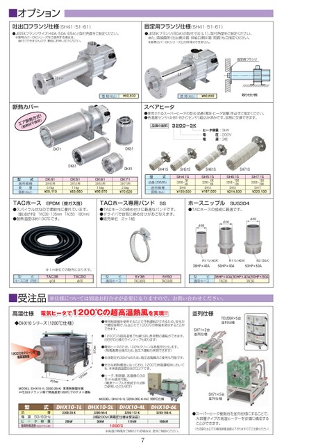 断熱カバー式!用)方使熱材不断熱ア断エ(70mmDK71型式適用機種質量価格(税込)DK41SH41用0.7㎏¥52,030DK61DK51SH51用1.1㎏¥52,690DK61SH61用1.5㎏¥53,680固定用フランジL1価格(税込)¥57,420価格(税込)¥57,420取り付け例スペアヒータ●使用されるスーパーヒータの型式・品番(電圧・ヒータ容量)を必ずご指定ください。●各温度センサ(A・B1・B2・Cセンサ)組込み済みです。容易に交換できます。品番の説明3200-3Kヒータ容量:3kW電圧:200V電源:3相DK51DK41DK71SH71用2.5㎏¥66,770SH41SSH51SSH61SSH71S型式品番(200V時)適用機種価格(税込)SH41S3K3200-・4KSH41¥137,500SH51S6K3200-・8KSH51¥160,600SH61S10K3200-・12KSH61¥184,800SH71S15K3200-・20KSH71¥275,000TACホースEPDM(接ガス面)●スパイラル状なので柔軟性に優れています。(最小曲げ半径TAC38:135mmTAC50:180mm)●耐熱温度は約100℃です。TACホース専用バンドSS●TACホースの締め付けに最適なバンドです。●ドライバで容易に締め付けがおこなえます。●販売単位2ヶ1組ホースニップルSUS304●TACホースの接続に最適です。φ50φ50φ38※1m単位での販売になります。R11/240A)R11/2(40A)R2(50A)38HP×40A50HP×40A50HP×50A型式ホース口径(内径)TAC38φ38TAC50φ50型式適用ホースSY38TAC38用SY50TAC50用型式適用ホース38HP×40A50HP×40A50HP×50ATAC38TAC50■受注品※仕様については別途お打合せが必要になりますので、お問い合わせください。型式番品源50/60Hz電ヒ量ー最高熱風温度(吐出口フランジ部)タ容MODEL:DHX10-1L3200-28C-K-X4)999℃仕様DHX10-1LDHX10-2LDHX10-4LDHX10-6L3200-28-K28kW3200-56-K3相200V(異電圧仕様は受注品)3200-112-K3200-168-K56kW1200℃112kW168kW※高温の熱風をご検討される場合は、是非ご相談ください。●スーパーヒータ複数台を並列仕様にすることで、大容量タイプの高温ヒーターを安価に構成することができます。(合流部吐出口での最高熱風温度は下がりますのでご注意ください)7並列仕様SH71×2台並列仕様TCU20K×5台並列仕様SH71×5台並列仕様●専用制御盤を使用することで予熱運転ができるため、安全かつ最短時間で、吐出口にて1200℃の熱風を発生することができます。●1200℃の超高温域でも繰り返し長時間の運転ができます。(999℃仕様のラインナップもあります)●充分な断熱構造になっており、1200℃熱風運転時においても、本体表面温度は80℃以下です。●本体耐圧約30kPaのため、高圧送風機のご使用も可能です。●電気ヒータのため、100%クリーンな熱風を吐出します。(熱風循環仕様のため、省エネ運転も実現できます)870㎜●ヒータ、制御盤、送風機の3点セットも販売可能。(電源ケーブルを接続すれば即ご使用いただけます)◆DHX10シリーズ(1200℃仕様)1200℃のクリーンな超高温熱風㎜1550850㎜MODEL:DHX10-1L(3200-28-K)専用制御盤付属※吐出口フランジ部で熱風温度1200℃でのテスト運転高温仕様電気ヒータで1200℃の超高温熱風を実現!!■オプション吐出口フランジ仕様(SH41・51・61)●JIS5Kフランジサイズ(40A・50A・65A)と取付角度をご指定ください。※断熱カバーDKシリーズをご使用する場合は、後付けできませんので、事前にお申し付けください。固定用フランジ仕様(SH41・51・61)●JIS5Kフランジ(80A)の取付寸法(L1)、取付角度をご指定ください。また、溶接箇所(吐出側片面・供給口側片面・両面)もご指定ください。※断熱カバーDKシリーズとの併用はできません。