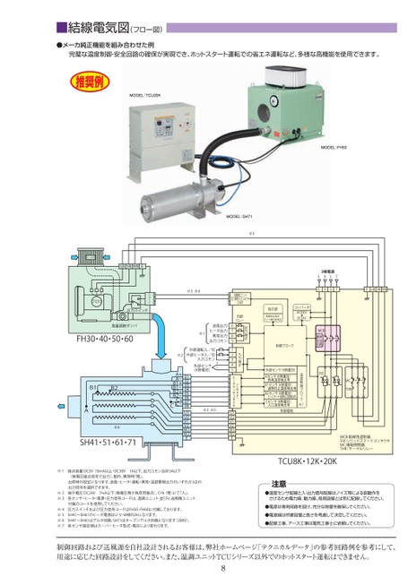 ■結線電気図(フロー図)●メーカ純正機能を組み合わせた例完璧な温度制御・安全回路の確保が実現でき、ホットスタート運転での省エネ運転など、多様な高機能を使用できます。推奨例MODEL:TCU20KMODEL:FH50MODEL:SH71※33相電源RSRSTTEUBVBWBEE指示部温度指示/設定タイマ現在値/設定コンバータAV200VDC24V制御基板MCB:配線用遮断器SSC:ソリッドステードコンタクタMC:電磁開閉器THR:サーマルリレーTCU8K・12K・20K注意●温度センサ配線と入・出力信号配線はノイズ等による誤動作をさけるため電力線、動力線、高周波線とは別に配線してください。●電源は専用回路を設け、充分な容量を確保してください。●電源線は所要容量と長さを考慮して決定してください。●配線工事、アース工事は電気工事士に依頼してください。MCTHRMCB最終安全回路SSC温度制御ブロック※7制御ブロック外部センサ(K熱電対)Aセンサ(K熱電対)熱風温度検出用B1センサ(K熱電対)過熱防止温度検出用B2センサ(K熱電対)ホットスタート・過熱防止温度検出用Cセンサ(K熱電対)入口温度検出用送風機ユニット圧力異常入力コネクタ(CN3P)出力端子内部リレー入力端子679854321(CN9P)ヒータセンサコネクタU1U2V1V2W12EW風量調節ダンパFH30・40・50・60※1送風出力ヒータ出力異常出力出力コモン※3※4(CN3P)圧力スイッチブロワフィルタUBVBWBE※2外部運転入/切外部ヒータ入/切入力コモン※3※5-+外部センサ(K熱電対)B1B2A※6SH41・51・61・71A+A-B1+B1-B2+B2-C+C-C0102030405060708U1U2V1V2W1W2E※1接点容量DC5V10mA以上・DC30V1A以下。出力コモン合計3A以下(無電圧接点信号で出力)。動作、異常時『閉』。出荷時の設定になります。送風・ヒータ・運転・異常・温度警報出力のいずれか3点の出力信号を選択できます。※2端子電圧DC24V7mA以下(無電圧微少負荷用接点)。ON(閉)にて『入』。※3各センサ・ヒータ・電源・圧力信号コードは、温調ユニット並びに送風機ユニット付属のコードを使用してください。※4圧力スイッチおよび圧力信号コードはFH50・FH60に付属しております。※5SH41〜SH61のヒータ電源はU・V・W相のみになります。※6SH41〜SH61はデルタ回路、SH71はオープンデルタ回路になります(200V)。※7各センサ設定値はスーパーヒータ型式・電圧により変わります。制御回路および送風源を自社設計されるお客様は、弊社ホームページ「テクニカルデータ」の参考回路例を参考にして、用途に応じた回路設計をしてください。また、温調ユニットTCUシリーズ以外でのホットスタート運転はできません。8