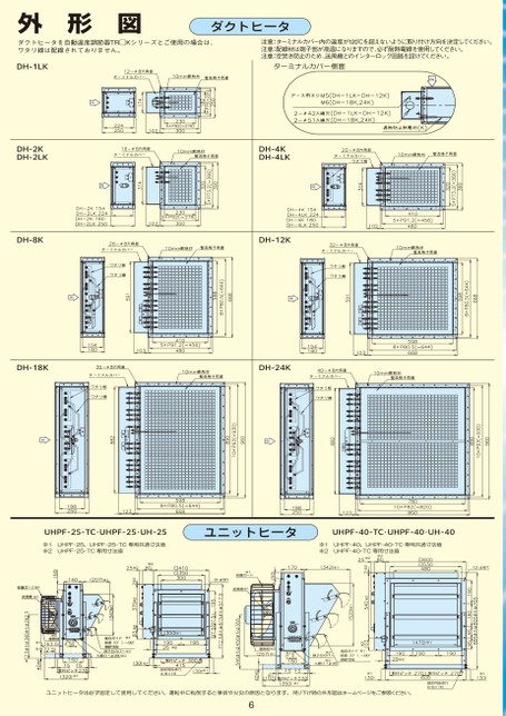 外形図ダクトヒータダクトヒータを自動温度調節器TR□Kシリーズとご使用の場合は、ワタリ線は配線されておりません。DH-1LKDH-2KDH-2LKDH-8K注意:ターミナルカバー内の温度が120℃を超えないように取り付け方向を決定してください。注意:配線材は端子部が高温になりますので、必ず耐熱電線を使用してください。注意:空焚き防止のため、送風機とのインターロック回路を設けてください。側面DH-4KDH-4LKDH-12KDH-18KDH-24KUHPF‐25‐TC・UHPF‐25・UH‐25ユニットヒータUHPF‐40‐TC・UHPF‐40・UH‐4066吊り下げ時の外形図はホームページをご参照ください。