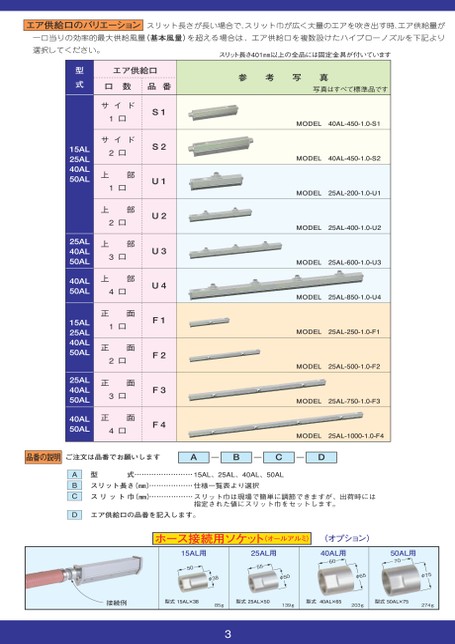 エア供給口のバリエーションエア供給口口数品番写真はすべて標準品ですMODEL40AL-450-1.0-S1MODEL40AL-450-1.0-S2MODEL25AL-200-1.0-U1MODEL25AL-400-1.0-U2MODEL25AL-600-1.0-U3MODEL25AL-850-1.0-U4MODEL25AL-250-1.0-F1MODEL25AL-500-1.0-F2MODEL25AL-750-1.0-F3MODEL25AL-1000-1.0-F4品番の説明エア供給口の品番を記入します。します。ホース接続用ソケット(オールアルミ)(オプション)15AL用05φ3825AL用55φ5040AL用0650AL用07φ65φ75型式15AL×3885g型式25AL×50139g型式40AL×65203g型式50AL×75274g