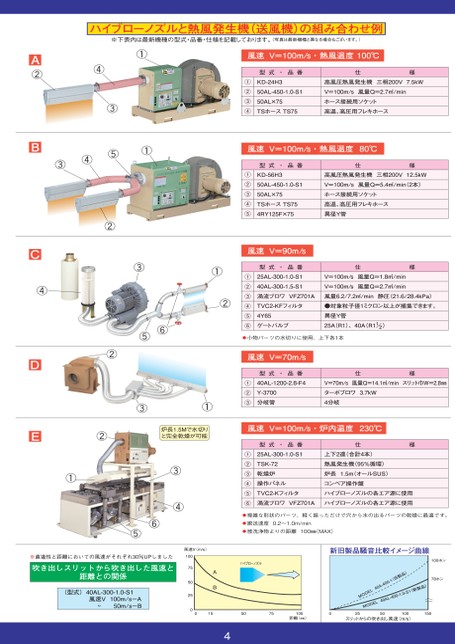 型式・品番25AL-300-1.0-S140AL-300-1.5-S1仕様V=100m/s風量Q=1.8㎥/minV=100m/s風量Q=2.7㎥/min渦流ブロワVFZ701A風量6.2/7.2㎥/min静圧(21.6/28.4kPa)TVC2-KFフィルタ●対象粒子径1ミクロン以上が捕集できます。4Y65ゲートバルブ異径Y管25A(R1)、40A(R1/)12①②③④⑤⑥型式・品番仕様40AL-1200-2.8-F4V=70m/s風量Q=14.1㎥/minスリット巾W=2.8㎜Y-3700分岐管ターボブロワ3.7kW4分岐①②③型式・品番25AL-300-1.0-S1TSK-72乾燥炉操作パネル仕様上下2連(合計4本)熱風発生機(95%循環)炉長1.5m(オールSUS)コンベア操作盤TVC2-Kフィルタハイブローノズルの各エア源に使用渦流ブロワVFZ701Aハイブローノズルの各エア源に使用①②③④⑤⑥風速V=100m/s・炉内温度230℃複雑な形状のパーツ、軽く振っただけで穴から水の出るパーツの乾燥に最適です。搬送速度0.2〜1.0m/min被洗浄物よりの距離100㎜(MAX)小物パーツの水切りに使用、上下各1本風速V=70m/s型式・品番KD-24H3仕様高風圧熱風発生機三相200V7.5kW50AL-450-1.0-S1V=100m/s風量Q=2.7㎥/min50AL×75ホース接続用ソケットTSホースTS75高温、高圧用フレキホース①②③④風速V=100m/s・熱風温度100℃型式・品番KD-56H3仕様高風圧熱風発生機三相200V12.5kW50AL-450-1.0-S1V=100m/s風量Q=5.4㎥/min2本)50AL×75TSホースTS754RY125F×75ホース接続用ソケット高温、高圧用フレキホース異径Y管①②③④⑤風速V=100m/s・熱風温度80℃風速V=90m/sハイブローノズルと熱風発生機(送風機)の組み合わせ例ABCDE(型式)40AL-300-1.0-S1風速V100m/s-A〃50m/s-B)品製旧)品製新1(S-00-1(0-4A.1-004-LA04L0L4EDOMEDOM