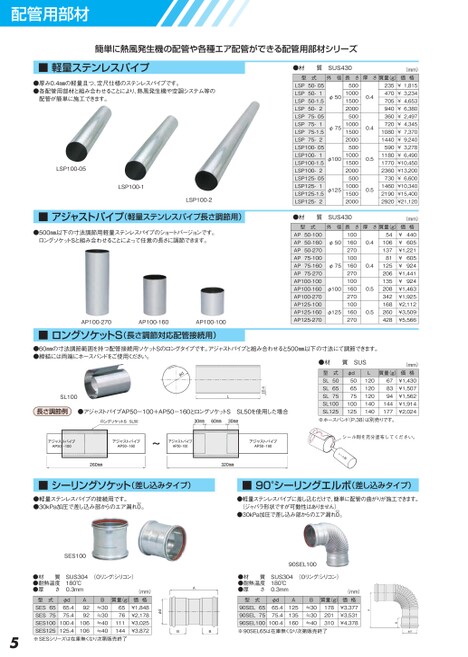 配管用部材簡単に熱風発生機の配管や各種エア配管ができる配管用部材シリーズ■軽量ステンレスパイプ●厚み0.4㎜の軽量且つ、定尺仕様のステンレスパイプです。●各配管用部材と組み合わせることにより、熱風発生機や空調システム等の配管が簡単に施工できます。LSP100-05LSP100-1LSP100-2■アジャストパイプ(軽量ステンレスパイプ長さ調節用)●500㎜以下の寸法調節用軽量ステンレスパイプのショートバージョンです。ロングソケットSと組み合わせることによって任意の長さに調節できます。AP100-270AP100-160AP100-100■ロングソケットS(長さ調節対応配管接続用)●材質SUS430型式外径LSP50-05LSP50-1LSP50-1.5LSP50-2LSP75-05LSP75-1LSP75-1.5LSP75-2LSP100-05LSP100-1LSP100-1.5LSP100-2LSP125-05LSP125-1LSP125-1.5LSP125-2φ50φ75φ100φ125長さ500100015002000500100015002000500100015002000500100015002000●材質SUS430型式外径AP50-100AP50-160AP50-270AP75-100AP75-160AP75-270AP100-100AP100-160AP100-270AP125-100AP125-160AP125-270φ50φ75φ100φ125長さ100160270100160270100160270100160270(mm)厚さ質量(g)価格0.40.40.50.523547070594036072010801440590118017702360730146021902920¥1,815¥3,234¥4,653¥6,380¥2,497¥4,345¥7,370¥9,240¥3,278¥6,490¥10,450¥13,200¥6,600¥10,340¥15,400¥21,120(mm)厚さ質量(g)価格0.40.40.50.55410613781125206135208342168260428¥440¥605¥1,221¥605¥924¥1,441¥924¥1,463¥1,925¥2,112¥3,509¥5,566●60㎜の寸法調節範囲を持つ配管接続用ソケットSのロングタイプです。アジャストパイプと組み合わせると500㎜以下の寸法にて調節できます。●締結には両端にホースバンドをご使用ください。●材質SUS(mm)質量(g)価格¥1,430¥1,507¥1,562¥1,914¥2,024678394144177型式SL50SL65SL75SL100SL125φd506575100125L1201201201401400.4LdφSL100長さ調節例●アジャストパイプAP50-100+AP50-160とロングソケットSSL50を使用した場合※ホースバンド(P.38)は別売りです。シール剤を充分塗布してください。シール剤■シーリングソケット(差し込みタイプ)■90°シーリングエルボ(差し込みタイプ)●軽量ステンレスパイプの接続用です。●30kPa加圧で差し込み部からのエア漏れ0。ゼロ●軽量ステンレスパイプに差し込むだけで、簡単に配管の曲がりが施工できます。●30kPa加圧で差し込み部からのエア漏れ0。ゼロ(ジャバラ形状ですが可動性はありません)SES10090SEL100●材質SUS304(Oリング:シリコン)●耐熱温度180℃●厚さ0.3mm(mm)A●材質SUS304(Oリング:シリコン)●耐熱温度180℃●厚さ0.3mm(mm)型式AB質量(g)φd65.475.4100.490SEL6590SEL7590SEL100※90SEL65は在庫無くなり次第販売終了≒30≒30≒40125135160178201310価格¥3,377¥3,531¥4,378ABφdBBφd価格¥1,848¥2,178¥3,025¥3,872B質量(g)A9型式φd65.475.4100.4125.4SES65SES75SES100SES125※SESシリーズは在庫無くなり次第販売終了≒30≒30≒40≒4065761111442921061065