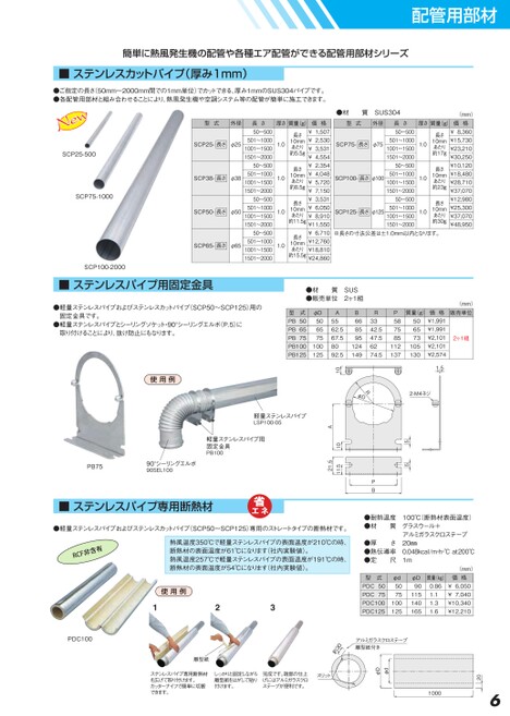 配管用部材簡単に熱風発生機の配管や各種エア配管ができる配管用部材シリーズ■ステンレスカットパイプ(厚み1mm)●ご指定の長さ(50mm〜2000mm間での1mm単位)でカットできる、厚み1mmのSUS304パイプです。●各配管用部材と組み合わせることにより、熱風発生機や空調システム等の配管が簡単に施工できます。●材質SUS304厚さ質量(g)価格型式外径SCP25-500SCP75-1000型式外径SCP25-長さφ25SCP38-長さφ38SCP50-長さφ50SCP65-長さφ65長さ50〜500501〜10001001〜15001501〜200050〜500501〜10001001〜15001501〜200050〜500501〜10001001〜15001501〜200050〜500501〜10001001〜15001501〜20001.01.01.01.0長さ10mmあたり約5.5g長さ10mmあたり約8.5g長さ10mmあたり約11.5g長さ10mmあたり約15.5g¥1,507¥2,530¥3,531¥4,554¥2,354¥4,048¥5,720¥7,150¥3,531¥6,050¥8,910¥11,550¥6,710¥12,760¥18,810¥24,860長さ50〜500501〜10001001〜15001501〜200050〜500501〜10001001〜15001501〜200050〜500501〜10001001〜15001501〜2000(mm)厚さ質量(g)価格1.01.01.0長さ10mmあたり約17g長さ10mmあたり約23g長さ10mmあたり約30g¥8,360¥15,730¥23,210¥30,250¥10,120¥18,480¥28,710¥37,070¥12,980¥25,300¥37,070¥48,950SCP75-長さφ75SCP100-長さφ100SCP125-長さφ125※長さの寸法公差は±1.0mm以内となります。(mm)販売単位2ヶ1組質量(g)506573105130価格¥1,991¥1,991¥2,101¥2,101¥2,5741.5B668595124149R3342.547.56274.5P587585112137A5562.567.58092.510型式PB50PB65PB75PB100PB125φD506575100125●材質SUS●販売単位2ヶ1組SCP100-2000■ステンレスパイプ用固定金具●軽量ステンレスパイプおよびステンレスカットパイプ(SCP50〜SCP125)用の固定金具です。●軽量ステンレスパイプとシーリングソケット・90°シーリングエルボ(P.5)に取り付けることにより、抜け防止にもなります。RφD2-M4ネジ55PB1011.521.5A使用例軽量ステンレスパイプLSP100-05軽量ステンレスパイプ用固定金具PB100PB7590°シーリングエルボ90SEL100■ステンレスパイプ専用断熱材●軽量ステンレスパイプおよびステンレスカットパイプ(SCP50〜SCP125)専用のストレートタイプの断熱材です。熱風温度350℃で軽量ステンレスパイプの表面温度が210℃の時、断熱材の表面温度が61℃になります(社内実験値)。熱風温度257℃で軽量ステンレスパイプの表面温度が191℃の時、断熱材の表面温度が54℃になります(社内実験値)。使用例123●耐熱温度100℃(断熱材表面温度)●材質グラスウール+アルミガラスクロステープ●厚さ20㎜●熱伝導率0.048kcal/m・h・℃at200℃●定尺1m(mm)型式PDC50PDC75PDC100PDC125φd5075100125φD90115140165質量(kg)価格0.861.11.31.6¥6,050¥7,040¥10,340¥12,2106201000φdφDアルミガラスクロステープ離型紙付き約30離型紙ステンレスパイプ専用断熱材を広げて取り付けます。カッターナイフで簡単に切断できます。しっかりと固定しながら離型紙をはがして貼り付けます。完成です。端部の仕上げにはアルミガラスクロステープが便利です。スリットPDC100