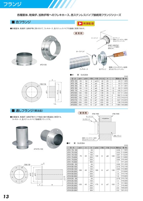 耐熱シリコンガスケット塗布またはフランジパッキン通しフランジフランジ各種筐体、乾燥炉、加熱炉等へのフレキホース、各ステンレスパイプ接続用フランジシリーズ■合フランジ●各種筐体、乾燥炉、加熱炉等に取り付けて、フレキホース、各ステンレスパイプの接続に使用できます。使用例ホースバンドホースバンド合フランジ耐熱シリコンガスケット塗布またはフランジパッキン乾燥炉、加熱炉等のフレキホースの接続に使用します。フレキホース合フランジ耐熱シリコンガスケット塗布またはフランジパッキン(mm)質量(g)価格245351831051573824736477381364¥1,925¥3,025¥1,001¥3,025¥3,377¥3,454¥6,160¥10,010¥12,870¥16,500¥23,980t1111.21.21.522222穴径φ4.5φ5φ5φ6φ6φ7φ7φ7φ7φ7φ7P.C.D.42686890108138150175200225280A2535353535454545606080穴数44488848121212φD2548080110130160175200225250310型式4FD254FD384FD504FD654FD754FD1004FD1254FD1504FD1754FD2004FD250φD12538506575100125150175200250●材質SUS304φD2P.C.D.φD1t4FD100A穴数・穴径■通しフランジ(受注品)●各種筐体、乾燥炉、加熱炉等のエア供給口壁の貫通部に使用する、フレキホース、各ステンレスパイプ接続用フランジです。使用例炉壁(外側)炉壁(内側)ホースバンドフレキホース炉壁断熱材(mm)価格質量(kg)0.390.530.670.800.941.10.560.750.931.11.31.50.791.11.41.72.02.3¥7,920¥8,580¥9,240¥9,680¥10,450¥11,220¥11,220¥12,100¥12,980¥13,640¥14,740¥15,620¥15,730¥16,500¥17,600¥18,480¥20,020¥21,010φD2穴数穴径P.C.D.1308φ61081608φ71381758φ7150●材質SUS304型式φD1A4TH75-504TH75-1004TH75-1504TH75-2004TH75-2504TH75-3004TH100-504TH100-1004TH100-1504TH100-2004TH100-2504TH100-3004TH125-504TH125-1004TH125-1504TH125-2004TH125-2504TH125-30075331004312543B5010015020025030050100150200250300501001502002503001.5AB4TH75-100穴数-穴径2φD1P.C.D.φD213