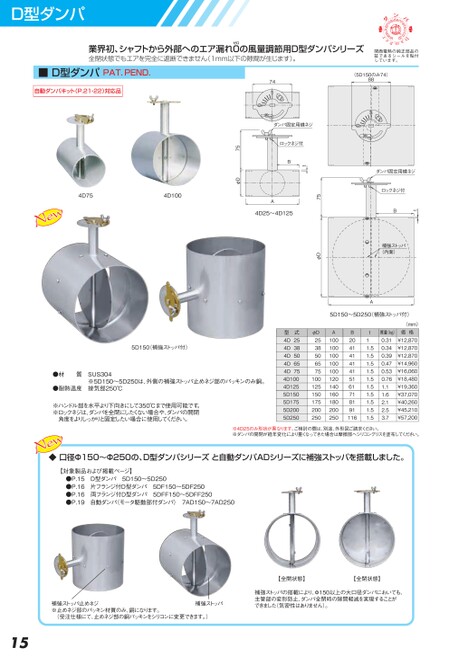 SAダンパ固定用蝶ネジロックネジ付Bt補強ストッパ(内面)ダンパ固定用蝶ネジO75φDロックネジ付Bt75φDA4D25〜4D1254D754D1005D150〜5D250補強ストッパ付)(mm)価格¥12,870¥12,870¥12,870¥14,960¥16,060¥18,480¥19,360¥37,070¥40,260¥45,210¥57,200質量(kg)0.310.340.390.470.530.761.11.62.12.53.7t.51.51.51.51.51.51.51.51.51.511型式4D254D384D504D654D754D1004D1255D1505D1755D2005D250φD2538506575100125150175200250A100100100100100120140160180200250B204141414151617181911165D150(補強ストッパ付)●材質SUS304※5D150〜5D250は、外側の補強ストッパ止めネジ部のパッキンのみ銅。●耐熱温度接気部250℃※ハンドル部を水平より下向きにして350℃まで使用可能です。※ロックネジは、ダンパを全閉にしたくない場合や、ダンパの開閉角度をよりしっかりと固定したい場合に使用してください。◆口径Φ150〜Φ250の、D型ダンパシリーズと自動ダンパADシリーズに補強ストッパを搭載しました。※4D25のみ形状が異なります。ご検討の際は、別途、外形図ご請求ください。※ダンパの開閉が経年変化により重くなってきた場合は摩擦部へシリコングリスを塗布してください。【対象製品および掲載ページ】●P.15D型ダンパ5D150〜5D250●P.16片フランジ付D型ダンパ5DF150〜5DF250●P.16両フランジ付D型ダンパ5DFF150〜5DFF250●P.19自動ダンパ(モータ駆動部付ダンパ)7AD150〜7AD250D型ダンパ業界初、シャフトから外部へのエア漏れ0の風量調節用D型ダンパシリーズ全閉状態でもエアを完全に遮断できません(1mm以下の隙間が生じます)。ゼロ関西電熱の純正部品の証であるシールを貼付しています。■D型ダンパPAT.PEND.自動ダンパキット(P.21・22)対応品74SO(5D150のみ74)88補強ストッパ止めネジ※止めネジ部のパッキン材質のみ、銅になります。(受注仕様にて、止めネジ部の銅パッキンをシリコンに変更できます。)【全開状態】【全閉状態】補強ストッパ補強ストッパの搭載により、Φ150以上の大口径ダンパにおいても、主管部の変形防止、ダンパ全閉時の隙間軽減を実現することができました(気密性はありません)。15