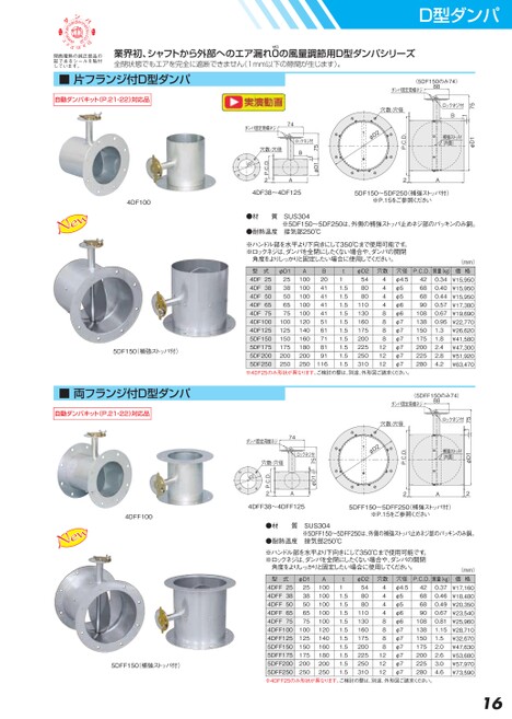 関西電熱の純正部品の証であるシールを貼付しています。業界初、シャフトから外部へのエア漏れ0の風量調節用D型ダンパシリーズ全閉状態でもエアを完全に遮断できません(1mm以下の隙間が生じます)。ゼロD型ダンパ(5DF150のみ74)8875ロックネジ付BtφD1補強ストッパ(内面)ダンパ固定用蝶ネジ穴数-穴径P.C.D.2Dφ2A5DF150〜5DF250(補強ストッパ付)※P.15をご参照くださいφD175tBロックネジ付A穴数-穴径P.C.D.22Dφ4DF38〜4DF125ダンパ固定用蝶ネジ744DF100■片フランジ付D型ダンパ自動ダンパキット(P.21・22)対応品●材質SUS304※5DF150〜5DF250は、外側の補強ストッパ止めネジ部のパッキンのみ銅。●耐熱温度接気部250℃(mm)P.C.D.質量(kg)価格426868901081381501752002252800.340.400.440.570.670.951.31.82.42.84.2¥15,950¥15,950¥15,950¥17,380¥19,690¥22,770¥26,620¥41,580¥47,300¥51,920¥63,470※ハンドル部を水平より下向きにして350℃まで使用可能です。※ロックネジは、ダンパを全閉にしたくない場合や、ダンパの開閉角度をよりしっかりと固定したい場合に使用してください。穴径φ4.5φ5φ5φ6φ6φ7φ7φ7φ7φ7φ7穴数44488848121212φD2548080110130160175200225250310t.51.51.51.51.51.51.51.51.51.511型式4DF254DF384DF504DF654DF754DF1004DF1255DF1505DF1755DF2005DF250φD12538506575100125150175200250A100100100100100120140160180200250B20414141415161718191116※4DF25のみ形状が異なります。ご検討の際は、別途、外形図ご請求ください。(5DFF150のみ74)88t75ロックネジ付φD1補強ストッパ(内面)A2ダンパ固定用蝶ネジ穴数-穴径P.C.D.22Dφ5DFF150〜5DFF250(補強ストッパ付)※P.15をご参照ください75tφD1ロックネジ付A穴数-穴径P.C.D.22Dφ4DFF38〜4DFF125ダンパ固定用蝶ネジ740.370.460.490.670.811.151.52.02.63.04.6¥17,160¥18,480¥20,350¥23,540¥25,960¥28,710¥32,670¥47,630¥53,680¥57,970¥73,59016●材質SUS304※5DFF150〜5DFF250は、外側の補強ストッパ止めネジ部のパッキンのみ銅。●耐熱温度接気部250℃※ハンドル部を水平より下向きにして350℃まで使用可能です。※ロックネジは、ダンパを全閉にしたくない場合や、ダンパの開閉角度をよりしっかりと固定したい場合に使用してください。(mm)型式At穴数P.C.D.質量(kg)価格φD2548080110130160175200225250310穴径φ4.5φ5φ5φ6φ6φ7φ7φ7φ7φ7φ744488844DFF254DFF384DFF504DFF654DFF754DFF1004DFF1255DFF1505DFF1755DFF2005DFF250※4DFF25のみ形状が異なります。ご検討の際は、別途、外形図ご請求ください。10010010010010012014016018020025042686890108138150175200225280.51.51.51.51.51.51.51.51.51.5812121211φD125385065751001251501752002505DF150(補強ストッパ付)■両フランジ付D型ダンパ自動ダンパキット(P.21・22)対応品4DFF1005DFF150(補強ストッパ付)