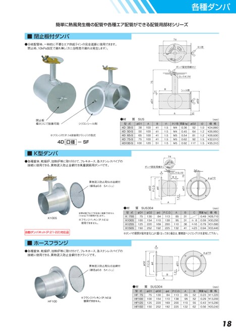 18簡単に熱風発生機の配管や各種エア配管ができる配管用部材シリーズ各種ダンパ(mm)価格¥24,860¥26,950¥28,930¥32,010¥35,310t21.01.21.21.51.5φD2t2φD252648192117シール剤Bt175φD1閉止板蝶ネジにて脱着可能シリコンシール剤※フランジ付(P.14溶接用フランジ)の型式4D口径SFA●材質SUS型式4D38-S4D50-S4D65-S4D75-S4D100-SφD138506575100A100100100100120B4141414151t11.51.51.51.51.5ネジ径質量(kg)M4M4M5M5M50.360.450.540.620.92■K型ダンパ●各種筐体、乾燥炉、加熱炉等に取り付けて、フレキホース、各ステンレスパイプの接続に使用できる、異物混入防止金網付き風量調節用ダンパです。74Sダンパ固定用蝶ネジO4-φ7穴75BCロックネジ付41.2AφD1φdP.C.D.φD2●材質SUS304(mm)型式K75SK100SK125SK150SφD175100125150φD2130154220252φd84110169192P.C.D.113138200225A8595110132B31313641C質量(kg)価格0.490.590.790.94¥28,710¥30,250¥31,680¥33,440≒8≒16≒23※ダンパの開閉が経年変化により重くなってきた場合は、摩擦部へシリコングリスを塗布して下さい。44-φ7穴異物混入防止用SUS金網付(線径φ0.85メッシュ)K100S全閉状態でもエアを完全に遮断できません(1mm以下の隙間が生じます)。※フランジパッキン(P.14)は使用できません。自動ダンパキット(P.21・22)対応品■ホースフランジ●各種筐体、乾燥炉、加熱炉等に取り付けて、フレキホース、各ステンレスパイプの接続に使用できる、異物混入防止金網付きフランジです。1.2BAφD1φdP.C.D.φD2異物混入防止用SUS金網付(線径φ0.85メッシュ)HF100※フランジパッキン(P.14)は使用できません。●材質SUS304(mm)型式HF75HF100HF125HF150φD175100125150φD2130154220252φd84110169192P.C.D.113138200225A8595110132B52525562質量(kg)価格0.230.290.430.56¥11,220¥13,200¥15,290¥20,240■閉止板付ダンパ●分岐配管時、一時的に不要なエア供給ラインの完全遮断に使用できます。閉止時、10kPa加圧で漏れ無し(カニ泡程度の漏れは発生します)。74SOネジ径ダンパ固定用蝶ネジロックネジ付