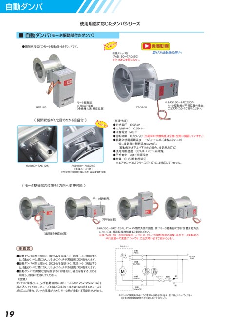 自動ダンパ使用用途に応じたダンパシリーズ■自動ダンパ(モータ駆動部付きダンパ)●開閉角度90°のモータ駆動部付きダンパです。補強ストッパ付(7AD150〜7AD250)※P.5をご参照ください。取付方法動画公開中!6AD100モータ駆動部出荷時の位置(全機種共通垂直位置)7AD150※7AD150〜7AD250のモータ駆動部が平行位置の場合、ご注文時に必ずご指示ください。《開閉状態がひと目でわかる目盛付》6AD50〜6AD1257AD150〜7AD250(補強ストッパ付)※全閉時の隙間軽減のため、ばね機構を搭載《共通仕様》●定格電圧DC24V●出力軸トルク0.59N・m●消費電流1A以下●回転時間0.7秒/90°(出荷時の作動角度は全開・全閉に調節しています。)●駆動部使用周囲温度-5℃〜+40℃(凍結しないこと)但し接気部の耐熱温度は250℃(駆動部を水平より下向きの場合、接気部350℃)●使用周囲湿度85%R.H.以下(非結露)●予想寿命約10万回程度●材質SUS(駆動部除く)※エアダンパ4ATシリーズ(P.17)には対応していません。《モータ駆動部の位置を4方向へ変更可能》モータ駆動部(平行位置)(出荷時垂直位置)※6AD50〜6AD125の、ダンパの開閉角度の調整、及びモータ駆動部の取付位置変更方法については、別途取扱説明書をご参照ください。注意:7AD150〜250補強ストッパ付)の、ダンパの開閉角度の調整、及びモータ駆動部の平行位置への変更については、ご注文時に必ずご指示ください。接続図●自動ダンパが閉状態から、DC24Vを赤線(+)、白線(-)に供給すると、自動ダンパは開になり、リミットスイッチが黒線側に切り替わります。●自動ダンパが開状態から、DC24Vを白線(+)、黒線(-)に供給すると、自動ダンパは閉になり、リミットスイッチが赤線側に切り替わります。●自動ダンパの開閉状態を表示させる場合は、極性を有するLEDを用意し、橙線に配線してください。《注意》ダンパの保護として、必ず駆動回路にはヒューズ(AC125V/250V1A)を組み込んでください。ヒューズを組み込まない、または1Aを超えるヒューズを組み込んだ場合、ダンパの保護ができず、モータ部が損傷する可能性があります。19LEDLED※ダンパの開閉動作中にDC電源の供給を切り替え、及び停止しないでください(必ず3秒間は開閉信号を供給し続けてください)。