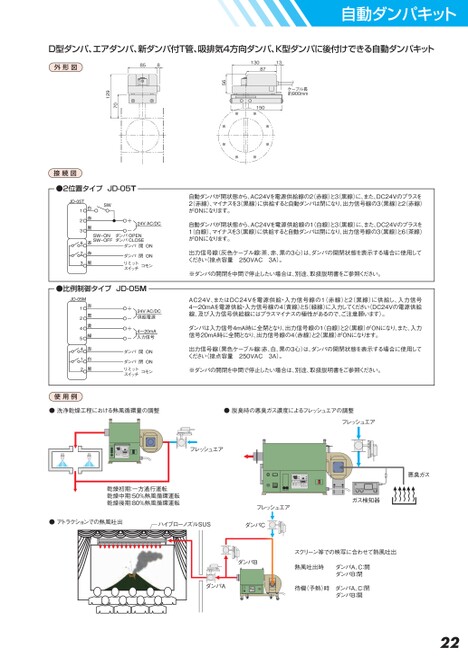 自動ダンパキットD型ダンパ、エアダンパ、新ダンパ付T管、吸排気4方向ダンパ、K型ダンパに後付けできる自動ダンパキット1301387ケーブル長約900mm15056外形図85870129接続図●2位置タイプJD-05T●比例制御タイプJD-05M自動ダンパが開状態から、AC24Vを電源供給線の2(赤線)と3(黒線)に、また、DC24Vのプラスを2(赤線)、マイナスを3(黒線)に供給すると自動ダンパは閉になり、出力信号線の3(黒線)と2(赤線)がONになります。自動ダンパが閉状態から、AC24Vを電源供給線の1(白線)と3(黒線)に、また、DC24Vのプラスを1(白線)、マイナスを3(黒線)に供給すると自動ダンパは開になり、出力信号線の3(黒線)と6茶線)がONになります。出力信号線(灰色ケーブル線:茶、赤、黒の3心)は、ダンパの開閉状態を表示する場合に使用してください(接点容量250VAC3A)。※ダンパの開閉を中間で停止したい場合は、別途、取扱説明書をご参照ください。AC24V、またはDC24Vを電源供給・入力信号線の1(赤線)と2(黒線)に供給し、入力信号4〜20mAを電源供給・入力信号線の4(黄線)と5(緑線)に入力してください(DC24Vの電源供給線、及び入力信号供給線にはプラスマイナスの極性があるので、ご注意願います)。ダンパは入力信号4mA時に全閉となり、出力信号線の1(白線)と2(黒線)がONになり、また、入力信号20mA時に全開となり、出力信号線の4(赤線)と2(黒線)がONになります。出力信号線(黒色ケーブル線:赤、白、黒の3心)は、ダンパの開閉状態を表示する場合に使用してください(接点容量250VAC3A)。※ダンパの開閉を中間で停止したい場合は、別途、取扱説明書をご参照ください。使用例●洗浄乾燥工程における熱風循環量の調整●脱臭時の悪臭ガス濃度によるフレッシュエアの調整フレッシュエアフレッシュエア乾燥初期:一方通行運転乾燥中期:50%熱風循環運転乾燥後期:80%熱風循環運転フレッシュエアガス検知器●アトラクションでの熱風吐出ハイブローノズルSUSダンパC悪臭ガスダンパBダンパAスクリーン等での映写に合わせて熱風吐出熱風吐出時ダンパA、C:開ダンパB:閉待機(予熱)時ダンパA、C:閉ダンパB:開22