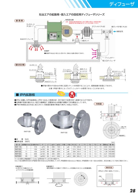ディフューザ吐出エアの拡散用・吸入エアの回収用ディフューザシリーズ熱風発生機注意:熱風発生機を乾燥炉等の上部に設置する場合は、熱風発生機が乾燥炉等の熱の影響を受けないように充分注意してください。デミフィルタ(P.43)新ダンパ付T管(P.24)新鮮空気一部排気K型ダンパ乾燥炉●乾燥炉の吐出口・吸入口に取り付け、効率よく拡散・回収ができます。プッシュカバー(ワンタッチ取り付け)50mmプッシュカバー吸入口ディフューザ吸入口ディフューザ100mm延長ソケットホースバンド断熱材プッシュカバー(ワンタッチ取り付け)50mm以下プッシュカバー(ワンタッチ取り付け)吐出口ディフューザ●炉壁の厚さが100mmの時に延長ソケットを利用することにより、配管接続を容易にできます。注意:炉壁の厚さによってはプッシュカバーは使用できないことがあります。使用例フレキホース(P.33〜)吐出口ディフューザ取り付け例フレキホースホースバンド■炉内拡散板穴数-穴径P.C.D.風量調節②(mm)L風量調節①BφD2φD1T2AT3RKP100●材質SUS●耐熱温度350℃RKP15028※1圧力損失は風量調節①・②ともに全閉状態での、20℃時の数値です。※2L寸法は断熱材を含めた炉壁面の厚みを50mm以内を想定しています。炉壁面厚み50mm以上の場合は、炉壁面厚み+35〜50mmを目安に、受注仕様としてL寸法をご指定ください。質量(kg)価格0.640.941.262.213.21¥22,110¥23,980¥25,960¥29,590¥33,330B1313131515T21.21.21.21.51.5T31.21.21.21.51.5穴径φ5φ5φ6φ6.5φ6.5P.C.D.A17021525031038028±535±645±750±968±11T11.01.01.01.21.2穴数44444L※28585858585φD1200245280340410φD2140185220280350型式処理風量(㎥/min)圧力損失(Pa)※1PRKP75RKP100RKP125RKP150RKP20047111628110130155200190φ75φ100φ125φ150φ200風量調節①・4ヶ所のネジを緩めることで、上下スライドによる風量調節風量調節②・固定用蝶ボルトを緩めて、円形のシャッタを回転させることによる風量調節。取付方法炉内より、炉体へ固定してください。炉壁●炉内に設置した炉内拡散板は、炉内へ吐出した熱風を90°、及び360°の全周方向へ変換することができます。●送風機の性能を損なわない低圧力損構造で、設置後も吐出風量の調整ができる構造となっています。●炉体の熱風吐出口付近に投入されている乾燥対象物の熱焼け(熱ダレ)を防止できます。外形図PT1