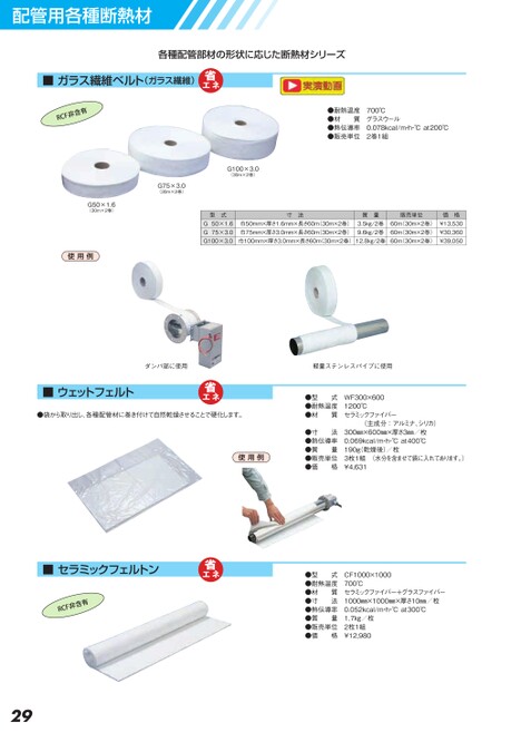 配管用各種断熱材各種配管部材の形状に応じた断熱材シリーズ■ガラス繊維ベルト(ガラス繊維)●耐熱温度700℃●材質グラスウール●熱伝導率0.078kcal/m・h・℃at200℃●販売単位2巻1組G100×3.0(30m×2巻)G75×3.0(30m×2巻)G50×1.6(30m×2巻)使用例型式G50×1.6G75×3.0G100×3.0寸法質量販売単位巾50mm×厚さ1.6mm×長さ60m(30m×2巻)巾75mm×厚さ3.0mm×長さ60m(30m×2巻)巾100mm×厚さ3.0mm×長さ60m(30m×2巻)3.5㎏/2巻9.6㎏/2巻12.8㎏/2巻60m(30m×2巻)60m(30m×2巻)60m(30m×2巻)価格¥13,530¥30,360¥39,050ダンパ部に使用軽量ステンレスパイプに使用■ウェットフェルト●袋から取り出し、各種配管材に巻き付けて自然乾燥させることで硬化します。使用例●型式WF300×600●耐熱温度1200℃●材質セラミックファイバー(主成分:アルミナ、シリカ)●寸法300㎜×600㎜×厚さ3㎜/枚●熱伝導率0.069kcal/m・h・℃at400℃●質量190g(乾燥後)/枚●販売単位3枚1組(水分を含ませて袋に入れてあります。)●価格¥4,631■セラミックフェルトン●型式CF1000×1000●耐熱温度700℃●材質セラミックファイバー+グラスファイバー●寸法1000㎜×1000㎜×厚さ10㎜/枚●熱伝導率0.052kcal/m・h・℃at300℃●質量1.7㎏/枚●販売単位2枚1組●価格¥12,98029