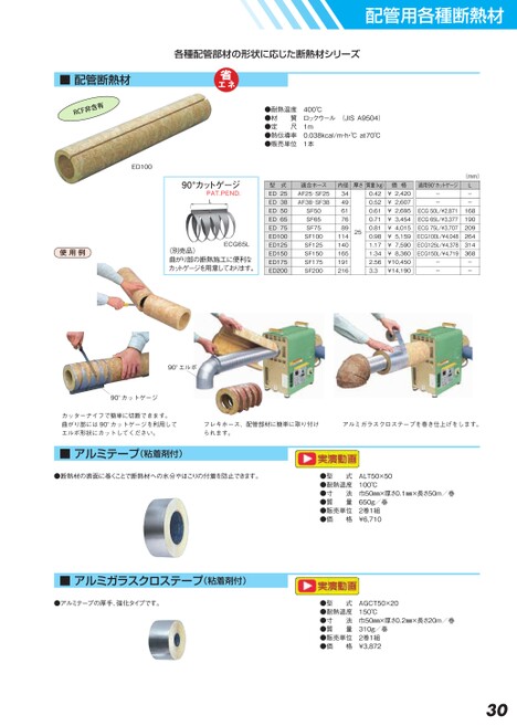配管用各種断熱材各種配管部材の形状に応じた断熱材シリーズ■配管断熱材(mm)L--168190209264314368--厚さ質量(kg)価格適用90°カットゲージ--ECG50L/¥2,871ECG65L/¥3,377ECG75L/¥3,707ECG100L/¥4,048ECG125L/¥4,378ECG150L/¥4,719--0.420.520.610.710.810.981.171.342.563.3¥2,420¥2,607¥2,695¥3,454¥4,015¥5,159¥7,590¥8,360¥10,450¥14,19025型式ED25ED38ED50ED65ED75ED100ED125ED150ED175ED200適合ホースAF25・SF25AF38・SF38SF50SF65SF75SF100SF125SF150SF175SF200内径3449617689114140165191216●耐熱温度400℃●材質ロックウール(JISA9504)●定尺1m●熱伝導率0.038kcal/m・h・℃at70℃●販売単位1本ED10090°カットゲージPAT.PEND.L使用例ECG65L(別売品)曲がり部の断熱施工に便利なカットゲージを用意しております。90°エルボ90°カットゲージカッターナイフで簡単に切断できます。曲がり部には90°カットゲージを利用してエルボ形状にカットしてください。■アルミテープ(粘着剤付)フレキホース、配管部材に簡単に取り付けられます。アルミガラスクロステープを巻き仕上げをします。●断熱材の表面に巻くことで断熱材への水分やほこりの付着を防止できます。■アルミガラスクロステープ(粘着剤付)●アルミテープの厚手、強化タイプです。●型式ALT50×50●耐熱温度100℃●寸法巾50㎜×厚さ0.1㎜×長さ50m/巻●質量650g/巻●販売単位2巻1組●価格¥6,710●型式AGCT50×20●耐熱温度150℃●寸法巾50㎜×厚さ0.2㎜×長さ20m/巻●質量310g/巻●販売単位2巻1組●価格¥3,87230