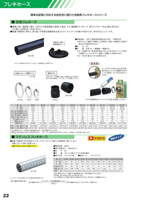 フレキホース簡単な配管に対応する自在性に優れた各耐熱フレキホースシリーズ■合成ゴムホース●摩擦に強く、屈曲性に優れ、100℃での熱風環境で使用した場合、アルミ製耐熱フレキホース、及びフレキホースNより耐久性があり、かつ熱による硬化も一切ありません。●軽量で柔軟性に優れた、取り扱いが容易な耐摩耗性合成ゴムホースで、ホースの曲げ半径が小さく、折れをおこしにくいです。柔軟性に優れた耐摩耗性ホース●耐熱温度100℃(最高使用温度は約120℃/1時間以内)※80℃以上で連続(1時間以上)使用された場合、材質変化と臭気が発生する可能性があります。●定尺3m●材質合成ゴム+硬鋼線+硬質PVC※ホース表面に白い析出物が発生することがありますが、ワックス成分の被膜(ブルーム)ですので、品質上、問題なくご使用できます。※ホースを足で踏んだりすると変形します。BA100※ホースの延長はP.40のソケットN(ホース接続用)をご使用ください。使用例合成ゴムホース専用バンド専用カフス(2ケ1組)合成ゴムホースを頻繁に可動して熱風を吐出する場合に取り付け部の強度アップのため、カフスを使用してください。ホースとカフスはねじ込み式の為、抜け防止としてシリコン接着剤(P.32)をしっかり塗布し、カフスをはめ込んでください。LS100LS75LS50BAC75カフスを使用時はホースバンド(P.38)を使用してください。BAC100型式内径φ外径φ常温での最大使用連続圧力(kPa)100℃の最大使用連続圧力(kPa)120℃での最大使用圧力/1時間(kPa)常温での曲げ半径(mm)圧力損失(Pa/m)質量(kg/3m)価格(定尺)BA2525.432.9150371825370.9BA3838.247.28020104533BA5050.859.78020105029BA7576.286.06020107025BA100101.6111.65012695233.39BA125131.3144.850126130225.22BA150156.3169.850126170206BA175181.8197.840126210198.25BA200207.8223.840105245189.3BA250258.0274.0401053101713.2¥84,480¥111,100LS200/¥5,940BAC200/¥21,780LS250/¥7,150BAC250/¥36,300強靭タイプ¥9,020LS25/¥2,838BAC25/¥1,6831.29¥11,220LS38/¥2,915BAC38/¥2,4201.56¥15,070LS50/¥2,915BAC50/¥2,5302.49¥22,110LS75/¥3,443BAC75/¥4,895専用バンド型式/価格(2ケ1組)専用カフス型式/価格(2ケ1組)※圧力損失はストレート状態での通過風速10m/s時の数値です(at20℃)。※内径φ、及び外径φ寸法には公差が生じます。※ホースには巻き方向があります。必ずホース専用バンドをお買い求めください。¥29,810LS100/¥3,883BAC100/¥6,160¥41,250LS125/¥4,081BAC125/¥7,590¥62,040LS150/¥4,763BAC150/¥11,000¥78,870LS175/¥5,940BAC175/¥14,960■ステンレスフレキホース●軽量で屈曲性のある不燃性フレキホースです。ステンレス製のため強靱性に優れています。切断にはナイフ等をご使用ください。切断方法はP.35をご参照ください。●耐熱温度500℃●最大使用圧力4.kPa以下●定尺4m●材質ステンレス板スパイラル状巻き締め●曲げ半径1.〜2×内径●適合バンドハイトルクバンドSF100※フレキホース内の風圧が上がると笛吹き音が発生します。型式内径φ外径φ圧力損失(Pa/m)質量(kg/4m)価格4mSF2525.429.9670.63SF383842.5500.96SF5051.256.8380.88SF6566.271.8291.12SF7576.281.8231.28SF100101.7107.3SF125126.7132.3SF150151.7157.3SF175176.7182.3SF200201.9209.4SF250251.9259.4171.68142.12112.569.538.53.45.84.32¥35,310¥35,310¥10,450¥12,540¥14,190¥17,600¥22,110¥26,400¥31,020¥35,310¥44,110※圧力損失はストレート状態での通過風速10m/s時の数値です(at20℃)。※内径φ、及び外径φ寸法には公差が生じます。※カニ泡程度のエア漏れが発生する場合がありますが、取り扱いには問題ありません。フレキホース内通過風速(m/s)210m/s×圧力損失(Pa/m)×フレキホース長さ(m)《圧力損失計算方法》圧力損失(Pa)=33