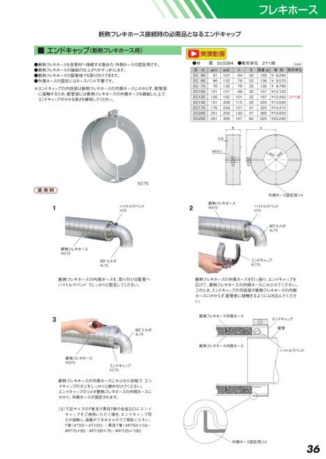 断熱フレキホース接続時の必需品となるエンドキャップフレキホース■エンドキャップ(断熱フレキホース用)●断熱フレキホースを各管材へ接続する場合の、外側ホースの固定用です。●断熱フレキホースの端部の仕上がりがすっきりします。●断熱フレキホースの配管後でも取り付けできます。●外側ホースの固定にはホースバンド不要です。※エンドキャップの内径部は断熱フレキホースの内側ホースにかからず、配管部に接触するため、配管部には断熱フレキホースの内側ホースを締結した上で、エンドキャップがかかる長さを確保してください。●材質SUS304●販売単位2ケ1組(mm)型式EC50EC65EC75EC100EC125EC150EC175EC200EC250φd1516676101126151176201251φd2107132132157182209234259309A64767689101115127140167BB323232323232474762質量(g)価格販売単位¥9,240¥9,570¥9,790¥10,120¥10,450¥13,640¥14,410¥15,620¥20,240100136130157187220325360525A2ケ1組0.8M5ネジd2φd1φ使用例1EC75ハイトルクバンドH75断熱フレキホースWS752ハイトルクバンドH75外側ホース固定用ツメ断熱フレキホースWS7590°エルボ4L75断熱フレキホースの内側ホースを、取り付ける配管へハイトルクバンドでしっかりと固定してください。390°エルボ4L75断熱フレキホースWS75エンドキャップEC75断熱フレキホースの外側ホースにかぶせた状態で、エンドキャップのネジをしっかりと締め付けてください。エンドキャップのツメが断熱フレキホースの外側ホースにかかり、外側ホースが固定されます。(注)下記サイズのT管及び異径T管の全差込口にエンドキャップをご使用いただく場合、エンドキャップ同士が接触し、装着ができませんのでご相談ください。T管(4T50〜4T150)・異径T管(4RT65×50・4RT75×65・4RT100×75・4RT125×100)90°エルボ4L75エンドキャップEC75断熱フレキホースの外側ホースを引っ張り、エンドキャップを広げて、断熱フレキホースの外側ホースにかぶせてください。このとき、エンドキャップの内径部が断熱フレキホースの内側ホースにかからず、配管部に接触するようにはめ込んでください。断熱フレキホース外側ホースエンドキャップ配管断熱フレキホース内側ホースハイトルクバンド外側ホース固定用ツメ36