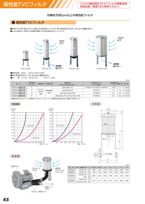 高性能TVCフィルタフィルタ選定時は〈P.41フィルタ捕集効率性能比較一覧表〉をご参照ください。対象粒子径5μm以上の高性能フィルタ■高性能TVCフィルタ●渦流ブロワ等の高圧ブロワに使用できる高性能フィルタです(最大使用吸引圧力約-29.kPa脈動圧禁止)。●1μmの場合は、約58%の粉塵を捕集できる洗浄再生対応フィルタです。80℃以下120℃以下TVC1-K-50TVC2-K-75送風機吸入口へTVC3-K-100TVC4-K-125送風機吸入口へ●耐熱温度80℃、TVC4-Kのみ120℃●最大使用吸引圧力約-29.kPa(脈動圧禁止)●材質フィルタ:ポリエステルスタンド:SUS型式処理風量(m3/min)捕集効率初期圧損接続口径(いずれかをご指示ください。)適合渦流ブロワ(テラル㈱製)TVC1-K-接続口径TVC2-K-接続口径TVC3-K-接続口径TVC4-K-接続口径258135μm以上約99%除去性能曲線参照φ50・φ65・φ75φ50・φ65・φ75φ50・φ65・φ75・φ100φ50・φ65・φ75・φ100・φ125・φ150※捕集効率は社内テストによる数値です。詳しくは、P.41フィルタ捕集効率性能比較一覧表をご参照ください。(mm)濾過面積(㎡)0.551.22.44.8質量(㎏)価格1.72.23.56.2¥48,950¥62,480¥79,420¥123,200VFZ401A・VFZ501A・VFZ601AVFZ701AVFZ801AVFZ901A外形図使用例渦流ブロワ45TACホースTAC50高性能TVCフィルタTVC1-K-50(mm)型式TVC1-KTVC2-KTVC3-KTVC4-KφD1(接続口径)/L50・65・75/3550・65・75/3550・65・75/35100/4550・65・75/35100・125・150/45φD2150150φD3170170200220A170200250B410710760C≒25≒25≒25P186186218Q214214246310315300810≒25268296D型ダンパ4D50TACホース専用バンドφD3φD2CBLφD1AQP4-5×10長丸406028TVC3-K-100TVC4-K-1252.04.06.08.010.012.014.0風量(m3/min)性能曲線圧力損失(kPa)0.500.450.400.350.300.250.200.150.100.050TVC1-K-50TVC2-K-750.51.01.52.02.53.03.54.04.5圧力損失(kPa)0.500.450.400.350.300.250.200.150.100.0505.05.5風量(m3/min)