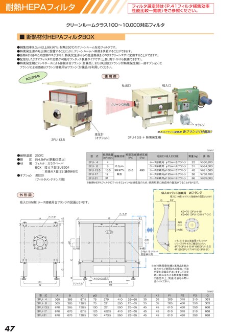 耐熱HEPAフィルタフィルタ選定時は〈P.41フィルタ捕集効率性能比較一覧表〉をご参照ください。クリーンルームクラス100〜10,000対応フィルタ■断熱材付HEPAフィルタBOX●捕集効率0.3μm以上99.7%、耐熱250℃のクリーンルーム対応フィルタです。●熱風発生源の吐出側に設置することにより、クリーンルームへ熱風を供給することができます。●断熱材付きのため放熱ロスが少なく、熱風発生源からの高温熱風をそのままクリーンエアに変換することができます。●配管をしたままでフィルタの交換が可能なワンタッチ脱着タイプです(上側、両サイドから脱着できます)。●熱風発生機とフレキホースによる接続は合フランジ(付属品)、または吐出口フランジ付熱風発生機(一部オプション)とフランジによる接続はフランジ接続用Wフランジ(付属品)を利用してください。使用例吐出口吸入口クリーンな熱風3FU-13.5差圧計(オプション)フランジ吸入口フランジ接続用Wフランジ(付属品)3FU-13.5+熱風発生機●耐熱温度250℃●耐圧約4.5kPa(脈動圧禁止)●材質フィルタ:ガラスペーパBOX:接ガス部SUS304●オプション差圧計(フィルタメンテナンス用):非接ガス部SS(断熱材付)型式3FU-43FU-83FU-13.53FU-173FU-31処理風量(m3/min)捕集効率初期圧損(Pa)最終圧損(Pa)4813.517310.3μm99.97%除去245490(mm)吐出口・吸入口口径質量(kg)価格ホース接続用φ75mm合フランジホース接続用φ75mm合フランジホース接続用φ100mm合フランジホース接続用φ125mm合フランジホース接続用φ150mm合フランジ2531455066¥530,200¥564,300¥621,500¥738,100¥869,000※耐熱HEPAフィルタのフィルタエレメントは焼成品のため、使用初期に焼成時の臭気がでることがあります。AIR(IN側)2-Rp1/8ソケット差圧検出用フランジ寸法は溶接用フランジ4Fシリーズ(P14)をご確認ください。4F753FU-4・8)4F1003FU-13.5)4F1253FU-17)4F150(3FU-31)※当社熱風発生機と本商品を組み合わせてご使用される場合、寸法が変わる場合があります。ご注文時に組み合わせる熱風発生機をご指定の上、別途寸法をお問い合わせください。4-10×25長穴P3P2(OUT側)φDBCEHアジャスタA365365670670670B365365365670670C87.5138.5138.587.5138.5φD7575100125150E270321321422.5473.5G410550550410550H25〜6525〜6525〜6525〜6525〜65J3535454545K13535454545P1305305610610610P2310450450310450P3210350350210350(mm)Q363363668668668P1Q型式3FU-43FU-83FU-13.53FU-173FU-31吸入口フランジ接続用Wフランジ吸入口(IN側)Wフランジ接続時の図面となりますK2GK2=70(3FU-4・8)K2=90(3FU-13.5・17・31)AIR(IN側)フィルタGK1J13フィルタA外形図吸入口(IN側)ホース接続用合フランジの図面となります。47