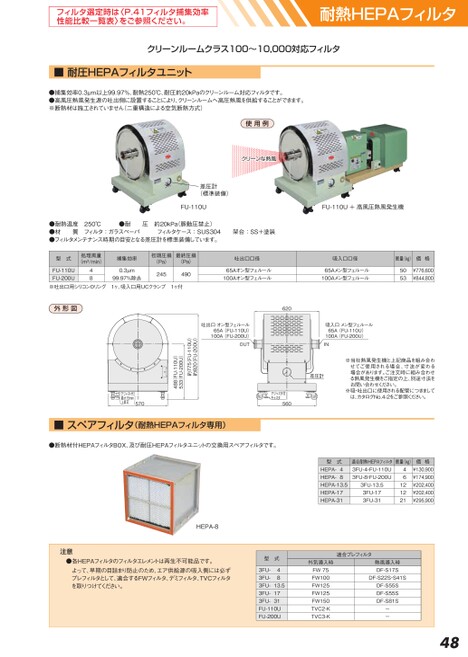 フィルタ選定時は〈P.41フィルタ捕集効率性能比較一覧表〉をご参照ください。耐熱HEPAフィルタ差圧計(標準装備)FU-110UFU-110U+高風圧熱風発生機吐出口口径65Aオン型フェルール100Aオン型フェルール吸入口口径質量(㎏)価格65Aメン型フェルール100Aメン型フェルール5053¥776,600¥844,800初期圧損(Pa)最終圧損(Pa)245490捕集効率0.3μm99.97%除去処理風量(m3/min)48型式FU-110UFU-200U※吐出口用シリコンOリング1ヶ、吸入口用UCクランプ1ヶ付外形図620●耐熱温度250℃●耐圧約20kPa(脈動圧禁止)●材質フィルタ:ガラスペーパフィルタケース:SUS304架台:SS+塗装●フィルタメンテナンス時期の目安となる差圧計を標準装備しています。クリーンルームクラス100〜10,000対応フィルタ■耐圧HEPAフィルタユニット●捕集効率0.3μm以上99.97%、耐熱250℃、耐圧約20kPaのクリーンルーム対応フィルタです。●高風圧熱風発生源の吐出側に設置することにより、クリーンルームへ高圧熱風を供給することができます。※断熱材は施工されていません(二重構造による空気断熱方式)使用例クリーンな熱風吐出口オン型フェルール65A(FU-110U)100A(FU-200U)OUT吸入口メン型フェルール65A(FU-110U)100A(FU-200U)IN差圧計アジャスタ付キャスタ560※当社熱風発生機と上記商品を組み合わせてご使用される場合、寸法が変わる場合があります。ご注文時に組み合わせる熱風発生機をご指定の上、別途寸法をお問い合わせください。※吸・吐出口に使用される配管につきましては、カタログNo.4-2をご参照ください。約820(FU-200U)約775(FU-110U)533(FU-200U)488(FU-110U))570アジャスト代最大15mm上昇可(81¥130,900¥174,900¥202,400¥202,400¥295,90046121221質量(㎏)価格適合耐熱HEPAフィルタ3FU-4・FU-110U3FU-8・FU-200U3FU-13.53FU-173FU-31型式HEPA-4HEPA-8HEPA-13.5HEPA-17HEPA-3148熱風導入時DF-S17SDF-S22S・S41SDF-S55SDF-S55SDF-S81S--適合プレフィルタ型式3FU-43FU-83FU-13.53FU-173FU-31FU-110UFU-200U外気導入時FW75FW100FW125FW125FW150TVC2-KTVC3-KHEPA-8注意●各HEPAフィルタのフィルタエレメントは再生不可能品です。よって、早期の目詰まり防止のため、エア供給源の吸入側には必ずプレフィルタとして、適合するFWフィルタ、デミフィルタ、TVCフィルタを取りつけてください。■スペアフィルタ(耐熱HEPAフィルタ専用)●断熱材付HEPAフィルタBOX、及び耐圧HEPAフィルタユニットの交換用スペアフィルタです。