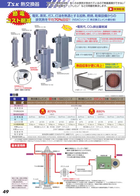 熱交換器節電コスト削減NSAC60NSAC40NSAC2070%NSAC•電気代、CO₂排出量削減熱交換器のエレメントはアルミ材ではなく、長期間使用でき殺菌性に優れ、耐久性を重視した銅材と、ステンレス材の2種類を使用しています。ドレンバルブを標準装備(放熱側出口に、縦置き・横置き付替可能)本体外側に断熱処理を標準装備(グラスウール+ガラスクロス)断熱処理(標準装備)NSAC60W従来品と比較して、各製品約10%UP!放熱側出口にドレンバルブを標準装備(縦置き・横置き付替可能)NSAC40WNSAC20-4-75NSAC40-8-100NSAC60-12-125NSAC40W-16-150NSAC60W-24-200NSAS20-4-75NSAS40-8-100NSAS60-12-125NSAS40W-16-150NSAS60W-24-200NSACシリーズ※ZAMは、日本製鉄株式会社の登録商標です。NSASシリーズ70%60%3244589412230415590118(グラスウール+ガラスクロス)推奨姿勢は縦置き(天地逆は不可)。横置きも可。¥1,507,000¥753,500¥503,800¥999,900出荷時、ドレンバルブは縦置き時の放熱側出口底面に取り付け(横置き時、付替え可能)¥302,500¥503,800¥753,500¥999,900¥1,507,000●熱交換器はユーティリティ不要で簡単に設置・接続することができます。●熱交換器での排気熱の再利用で、「節電によるコスト削減」と「CO₂排出量の削減」を実現。¥302,50049