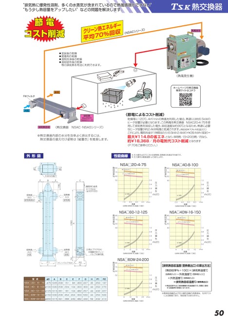 節電コスト削減(NSACシリーズ)熱交換器ホームページの熱交換器専用サイトはコチラ(NSASシリーズ)NSAC・NSASシリーズ》※熱交換器内部の水分を効率よく排出するには、熱交換器の据え付け姿勢は『縦置き』を推奨します。《節電によるコスト削減》乾燥等に120℃、4㎥/minの熱風を利用した場合、熱源には約6.5kWのヒータ容量が必要となります。この熱風を熱交換器NSAC20-4-75を使用して排気熱を回収した場合、回収温度は約90℃となるため、熱源に必要なヒータ容量が約2.4kW程度と低減されます。(熱回収率70%・外気温20℃)これにより、電気料金が1時間当たり(6.5kW-2.4kW)×¥28/kWh仮定)=最大¥114.8の省エネ約¥18,368/月の電気代コスト削減となります(P.70をご参照ください。)となり、8時間/日×20日間/月なら、NSA□40-8-100銅仕様(NSAC)ステンレス仕様(NSAS)NSA□40W-16-150銅仕様(NSAC)ステンレス仕様(NSAS)8070605080706050NSA□20-4-75銅仕様(NSAC)ステンレス仕様(NSAS)NSA□60-12-125銅仕様(NSAC)ステンレス仕様(NSAS)NSA□60W-24-200銅仕様(NSAC)ステンレス仕様(NSAS)807060508070605080706050502-閉止プラグ(6A)※横置き時ドレンバルブ付替可能ドレンバルブ(6A)NSANSANSANSANSA